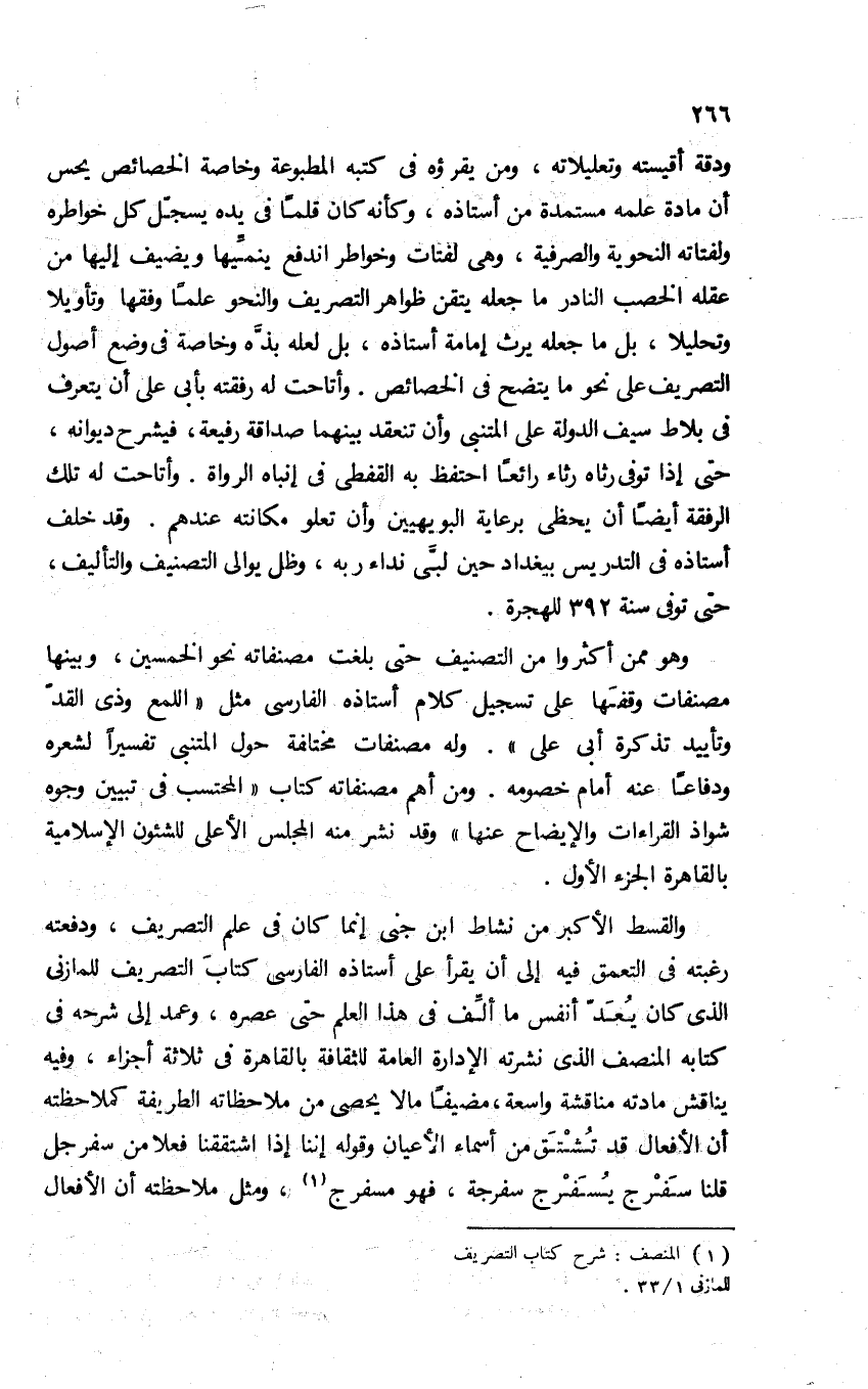 ودقة أقيسته وتعليلاته، ومن يقرؤه في كتبه المطبوعة وخاصة الخصائص يحس أن مادة علمه مستمدة من أستاذه، وكأنه كان قلما في يده يسجل كل خواطره ولفتاته النحوية والصرفية، وهي لفتات وخواطر اندفع ينميها ويضيف إليها من عقله الخصب النادر ما جعله يتقن ظواهر التصريف والنحو علما وفقها وتأويلا وتحليلا، بل ما جعله يرث إمامة أستاذه، بل لعله بذَّه وخاصة في وضع أصول التصريف على نحو ما يتضح في الخصائص. وأتاحت له رفقته بأبي علي أن يتعرف في بلاط سيف الدولة على المتنبي وأن تنعقد بينهما صداقة رفيعة، فيشرح ديوانه، حتى إذا توفي رثاه رثاء رائعا احتفظ به القفطي في إنباه الرواة. وأتاحت له تلك الرفقة أيضا أن يحظى برعاية البويهيين وأن تعلو مكانته عندهم. وقد خلف أستاذه في التدريس ببغداد حين لبى نداء ربه، وظل يوالي التصنيف والتأليف، حتى توفي سنة 392 للهجرة.