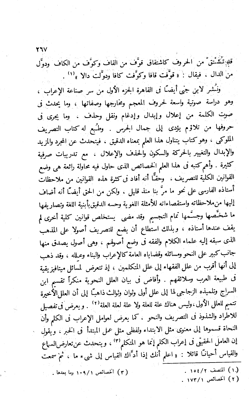 ونُشر لابن جني أيضا في القاهرة الجزء الأول من سر صناعة الإعراب، وهو دراسة صوتية واسعة لحروف المعجم ومخارجها وصفاتها، وما يحدث في صوت الكلمة من إعلال وإبدال وإدغام ونقل وحذف، وما يجري في حروفها من تلاؤم يؤدي إلى جمال الجرس. وطبع له كتاب التصريف الملوكي، وهو كتاب يتناول هذا العلم بمعناه الدقيق، فيتحدث عن المجرد والمزيد والإبدال والتغيير بالحركة والسكون والحذف والإعلال، مع تدريبات صرفية كثيرة. وأهم كتبه في هذا العلم الخصائص الذي حاول فيه محاولة رائعة هي وضع القوانين الكلية للتصريف، وحقا إنه أفاد في كثرة هذه القوانين من ملاحظات أستاذه الفارسي على نحو ما مر بنا منذ قليل، ولكن من الحق أيضا أنه أضاف إليها من ملاحظاته واستقصاءاته للأمثلة اللغوية وحسه الدقيق بأبنية اللغة وتصاريفها ما شخَّصها وجسَّمها تمام التجسيم, وقد مضى يستخلص قوانين كلية أخرى لم يقف عندها أستاذه، وبذلك استطاع أن يضع للتصريف أصولا على المذهب الذي سبقه إليه علماء الكلام والفقه في وضع أصولهم، وهي أصول يصدق منها جانب كبير على النحو ومسائله وقضاياه العامة كالإعراب والبناء وعلله، وقد ذهب إلى أنها أقرب من علل الفقهاء إلى علل المتكلمين، إذ تتعرض لمسائل ميتافيزيقية في طبيعة العرب وسلائقهم. وأفاض في بيان العلل النحوية, منكرا تقسيم ابن السراج وتلميذه الزجاجي لها إلى علل أولى وثوانٍ وثوالث, ذاهبا إلى أن العلل الأخيرة تتميم للعلل الأولى، وليس هناك علة للعلة ولا علة لعلة العلة2. ويعرض في تفصيل للاطراد والشذوذ في التصريف والنحو كما يعرض لعوامل الإعراب في الكلم, وأن النحاة قسموها إلى معنوي مثل الابتداء, ولفظي مثل عمل المبتدأ في الخبر، ويقول: إن العامل الحقيقي في إعراب الكلم إنما هو المتكلم3، ويتحدث عن تعارض السماع والقياس أحيانا قائلا: "اعلم أنك إذا أدَّاك القياس إلى شيء ما، ثم سمعت