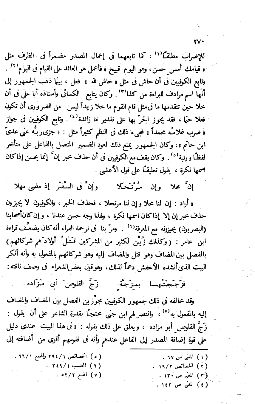 وقد خالفه في ذلك جمهور الكوفيين مجوزين الفصل بين المضاف والمضاف إليه بالمفعول به7، وانتصر لهم ابن جني محتجا بقدرة الشاعر على أن يقول: زجَّ القلوصِ أبو مزاده، ويعلق على ذلك بقوله: "في هذا البيت عندي دليل على قوة إضافة المصدر إلى الفاعل عندهم, وأنه في نفوسهم أقوى من إضافته إلى