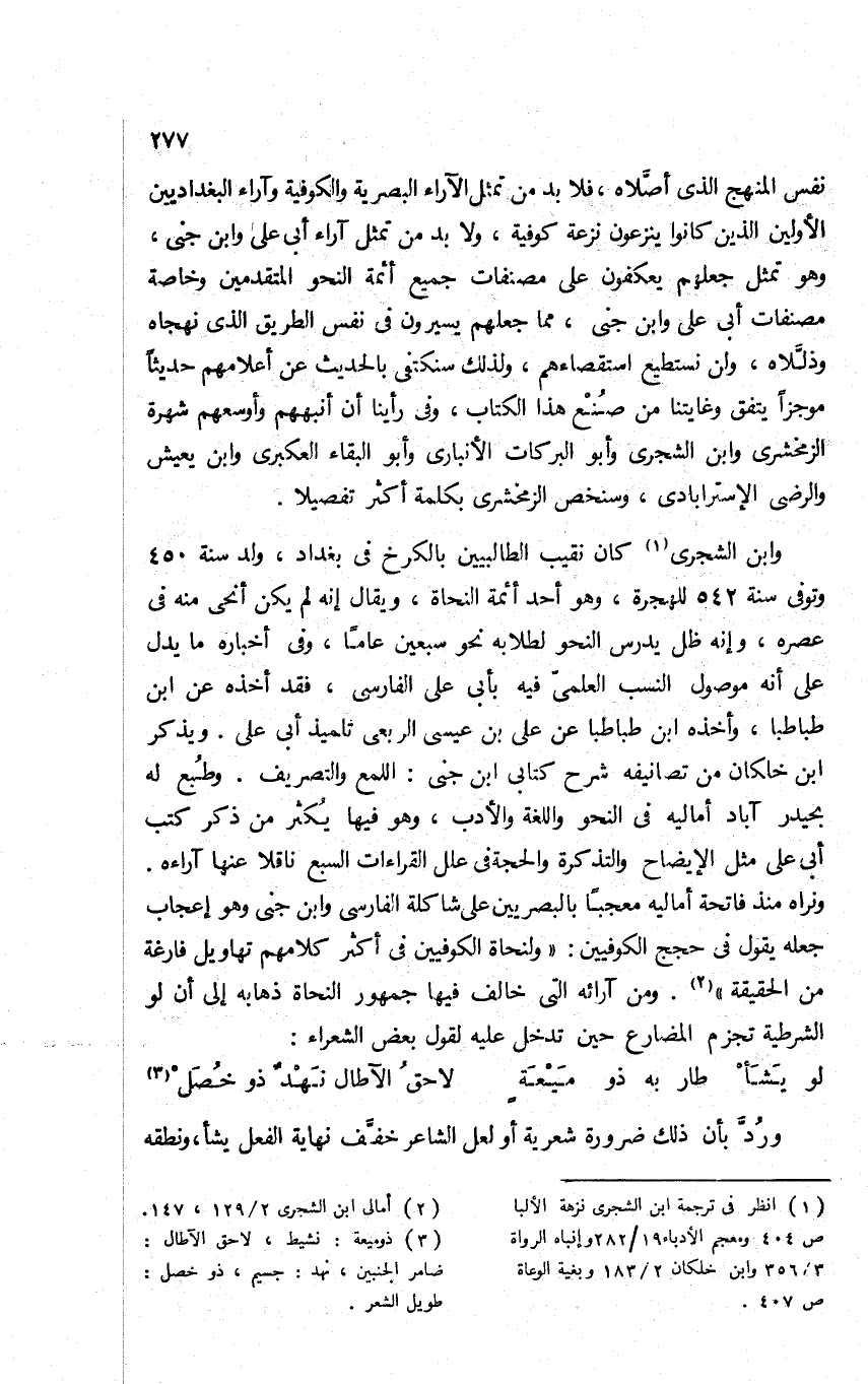 وابن الشجري1 كان نقيب الطالبيين بالكرخ في بغداد، ولد سنة 450 وتوفي سنة 542 للهجرة، وهو أحد أئمة النحاة، ويقال: إنه لم يكن أنحى منه في عصره، وإنه ظل يدرس النحو لطلابه نحو سبعين عاما، وفي أخباره ما يدل على أنه موصول النسب العلمي فيه بأبي علي الفارسي، فقد أخذه عن ابن طباطبا، وأخذه ابن طباطبا عن علي بن عيسى الربعي تلميذ أبي علي. ويذكر ابن خلكان من تصانيفه شرح كتابي ابن جني: اللمع والتصريف. وطبع له بحيدر آباد أماليه في النحو واللغة والأدب، وهو فيها يُكثر من ذكر كتب أبي علي مثل الإيضاح والتذكرة والحجة في علل القراءات السبع, ناقلا عنها آراءه. ونراه منذ فاتحة أماليه معجبا بالبصريين على شاكلة الفارسي وابن جني وهو إعجاب جعله يقول في حجج الكوفيين: "ولنحاة الكوفيين في أكثر كلامهم تهاويل فارغة من الحقيقة"2. ومن آرائه التي خالف فيها جمهور النحاة, ذهابه إلى أن لو الشرطية تجزم المضارع حين تدخل عليه لقول بعض الشعراء:
