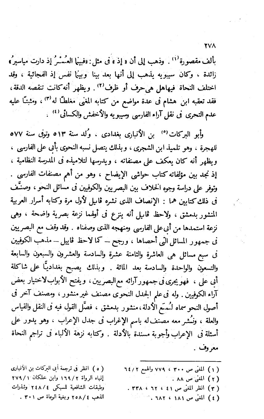 وأبو البركات5 بن الأنباري بغدادي، ولد سنة 513 وتوفي سنة 577 للهجرة، وهو تلميذ ابن الشجري، وبذلك يتصل نسبه النحوي بأبي علي الفارسي، ويظهر أنه كان يعكف على مصنفاته، ويدرسها لتلاميذه في المدرسة النظامية، إذ نجد بين مؤلفاته كتاب حواشي الإيضاح، وهو من أهم مصنفات الفارسي. وتوفر على دراسة وجوه الخلاف بين البصريين والكوفيين في مسائل النحو، وصنف في ذلك كتابين هما: الإنصاف الذي نشره فايل لأول مرة وكتابه أسرار العربية المنشور بدمشق، ولاحظ فايل أنه ينزع في أولهما نزعة بصرية واضحة، وهي نزعة استمدها من أبي علي الفارسي ومنهجه الذي وصفناه. وقد وقف مع البصريين في جمهور المسائل التي أحصاها، ورجح -كما لاحظ فايل- مذهب الكوفيين في سبع مسائل هي: العاشرة والثامنة عشرة والسادسة والعشرون والسبعون والسابعة والتسعون والواحدة والسادسة بعد المائة. وبذلك يصبح بغداديا على شاكلة أبي علي، فهو يجري في جمهور آرائه مع البصريين، ويفتح الأبواب لاختيار بعض آراء الكوفيين. وله في علم الجدل النحوي مصنف غير منشور، ومصنف آخر في أصول النحو سماه لُمَع الأدلة، منشور بدمشق، فصَّل القول فيه في النقل والقياس والعلة، ونُشر معه مصنف له باسم الإغراب في جدل الإعراب، وهو يدور على أسئلة في الإعراب وأجوبة مسندة بالأدلة, وكتابه نزهة الألباء في تراجم النحاة معروف.