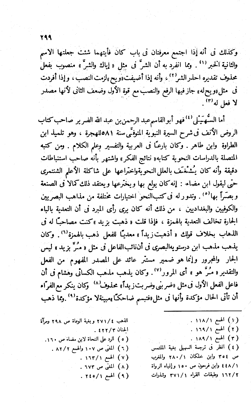 أما السهيلي4 فهو أبو القاسم عبد الرحمن بن عبد الله الضرير صاحب كتاب الروض الأنف في شرح السيرة النبوية المتوفى سنة 581 للهجرة، وهو تلميذ ابن الطراوة وابن طاهر. وكان بارعا في العربية والتفسير وعلم الكلام. ومن كتبه المتصلة بالدراسات النحوية كتابه "نتائج الفكر" واشتهر بأنه صاحب استنباطات دقيقة, وأنه كان يشغف بالعلل النحوية واختراعها على شاكلة الأعلم الشنتمري حتى ليقول ابن مضاء: إنه كان يولع بها ويخترعها ويعتقد ذلك كمالا في الصنعة وبَصَرا بها5. وتدور له في كتب النحو اختيارات مختلفة من مذاهب البصريين والكوفيين والبغداديين، من ذلك أنه كان يرى رأي المبرد في أن التعدية بالباء الجارة تخالف التعدية بالهمزة، فإذا قلت: "ذهبت بزيد" كنت مصاحبا له في الذهاب بخلاف قولك: "أذهبت زيدا" معديا للفعل ذهب بالهمزة6. وكان يذهب مذهب ابن درستويه البصري في أن نائب الفاعل في مثل: "مر بزيد" ليس الجار والمجرور وإنما هو ضمير مستتر عائد على المصدر المفهوم من الفعل والتقدير "مر هو" أي: المرور7. وكان يذهب مذهب الكسائي وهشام في أن فاعل الفعل الأول في مثل: "ضربني وضربت زيدا" محذوف8, وكان ينكر مع الفراء أن تأتي الحال مؤكدة وأنها في مثل: {فَتَبَسَّمَ ضَاحِكًا} مبنية لا مؤكدة9. ومما ذهب