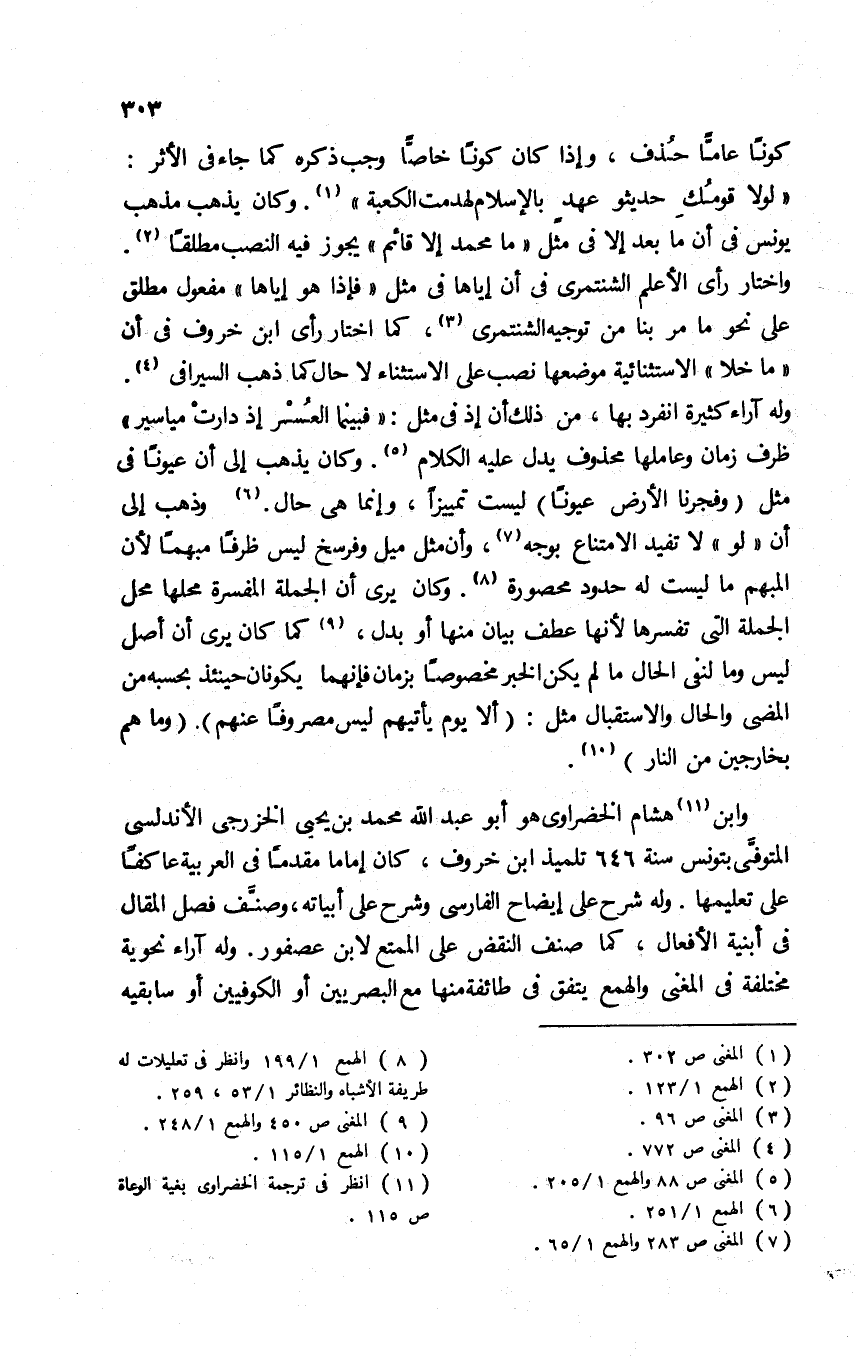 وابن11 هشام الخضراوي هو أبو عبد الله محمد بن يحيى الخزرجي الأندلسي المتوفى بتونس سنة 646 تلميذ ابن خروف، كان إماما مقدما في العربية عاكفا على تعليمها. وله شرح على إيضاح الفارسي وشرح على أبياته، وصنف فصل المقال في أبنية الأفعال، كما صنف النقض على الممتع لابن عصفور. وله آراء نحوية مختلفة في المغني والهمع يتفق في طائفة منها مع البصريين أو الكوفيين أو سابقيه