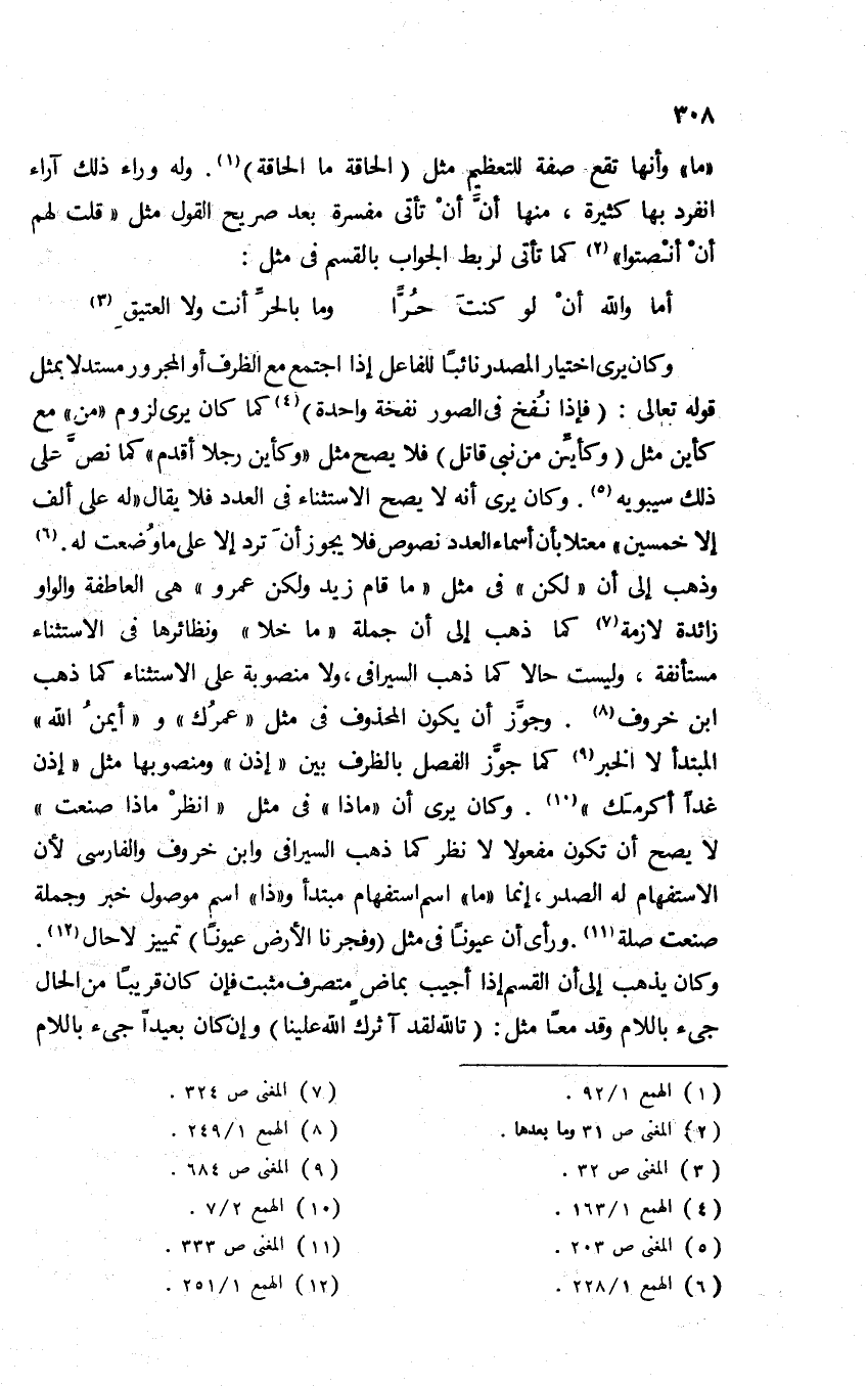 "ما" وأنها تقع صفة للتعظيم مثل: {الْحَاقَّةُ، مَا الْحَاقَّةُ} 1. وله وراء ذلك آراء انفرد بها كثيرة، منها أنَ أَنْ تأتي مفسرة بعد صريح القول مثل: "قلت لهم أَنْ أنصتوا"2 كما تأتي لربط الجواب بالقسم في مثل: