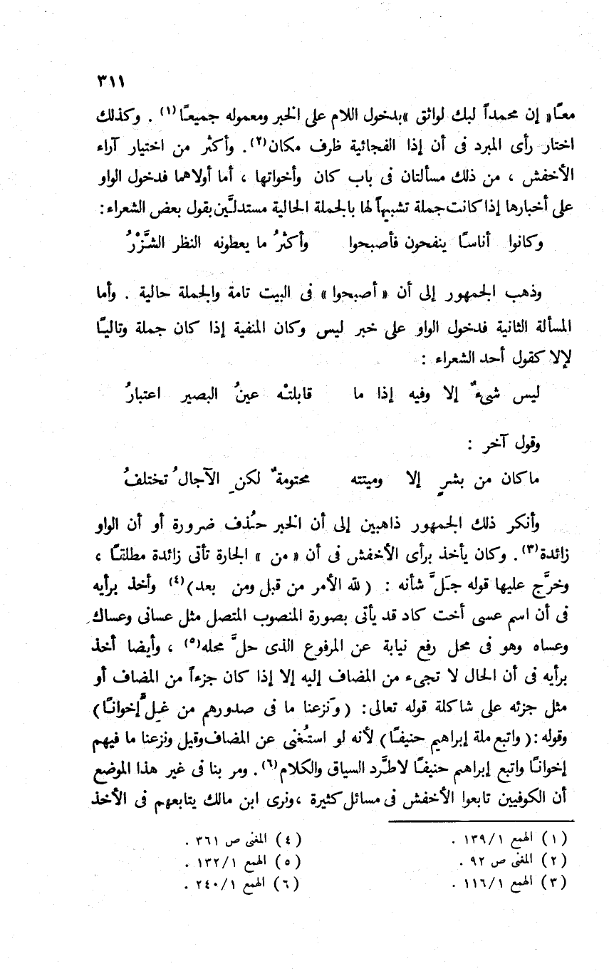 وأنكر ذلك الجمهور ذاهبين إلى أن الخبر حذف ضرورة أو أن الواو زائدة3. وكان يأخذ برأي الأخفش في أن "من" الجارة تأتي زائدة مطلقا، وخرج عليها قوله جل شأنه: {لِلَّهِ الْأَمْرُ مِنْ قَبْلُ وَمِنْ بَعْدُ} 4, وأخذ برأيه في أن اسم عسى أخت كاد قد يأتي بصورة المنصوب المتصل مثل: عساني وعساك وعساه وهو في محل رفع نيابة عن المرفوع الذي حل محله5، وأيضا أخذ برأيه في أن الحال لا تجيء من المضاف إليه إلا إذا كان جزءا من المضاف أو مثل جزئه على شاكلة قوله تعالى: {وَنَزَعْنَا مَا فِي صُدُورِهِمْ مِنْ غِلٍّ إِخْوَانًا} , وقوله: {وَاتَّبَعَ مِلَّةَ إِبْرَاهِيمَ حَنِيفًا} لأنه لو استُغني عن المضاف وقيل: ونزعنا ما فيهم إخوانا, واتبع إبراهيم حنيفا لاطرد السياق والكلام6. ومر بنا في غير هذا الموضع أن الكوفيين تابعوا الأخفش في مسائل كثيرة، ونرى ابن مالك يتابعهم في الأخذ