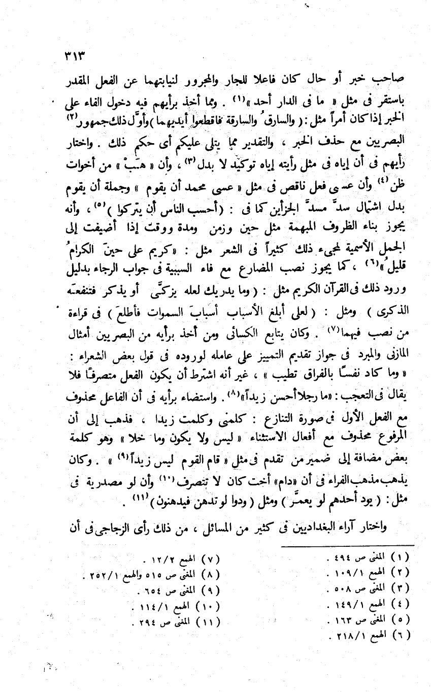 غير أنه اشترط أن يكون الفعل متصرفا, فلا يقال في التعجب: "ما رجلا أحسن زيدا"8. واستضاء برأيه في أن الفاعل محذوف مع الفعل الأول في صورة التنازع: كلمني وكلمت زيدا، فذهب إلى أن المرفوع محذوف مع أفعال الاستثناء "ليس ولا يكون وما خلا" وهو كلمة بعض مضافة إلى ضمير من تقدم في مثل: "قام القوم ليس زيدا"9. وكان يذهب مذهب الفراء في أن "دام" أخت كان لا تتصرف10, وأن لو مصدرية في مثل: {يَوَدُّ أَحَدُهُمْ لَوْ يُعَمَّرُ} ومثل: {وَدُّوا لَوْ تُدْهِنُ فَيُدْهِنُونَ} 11.