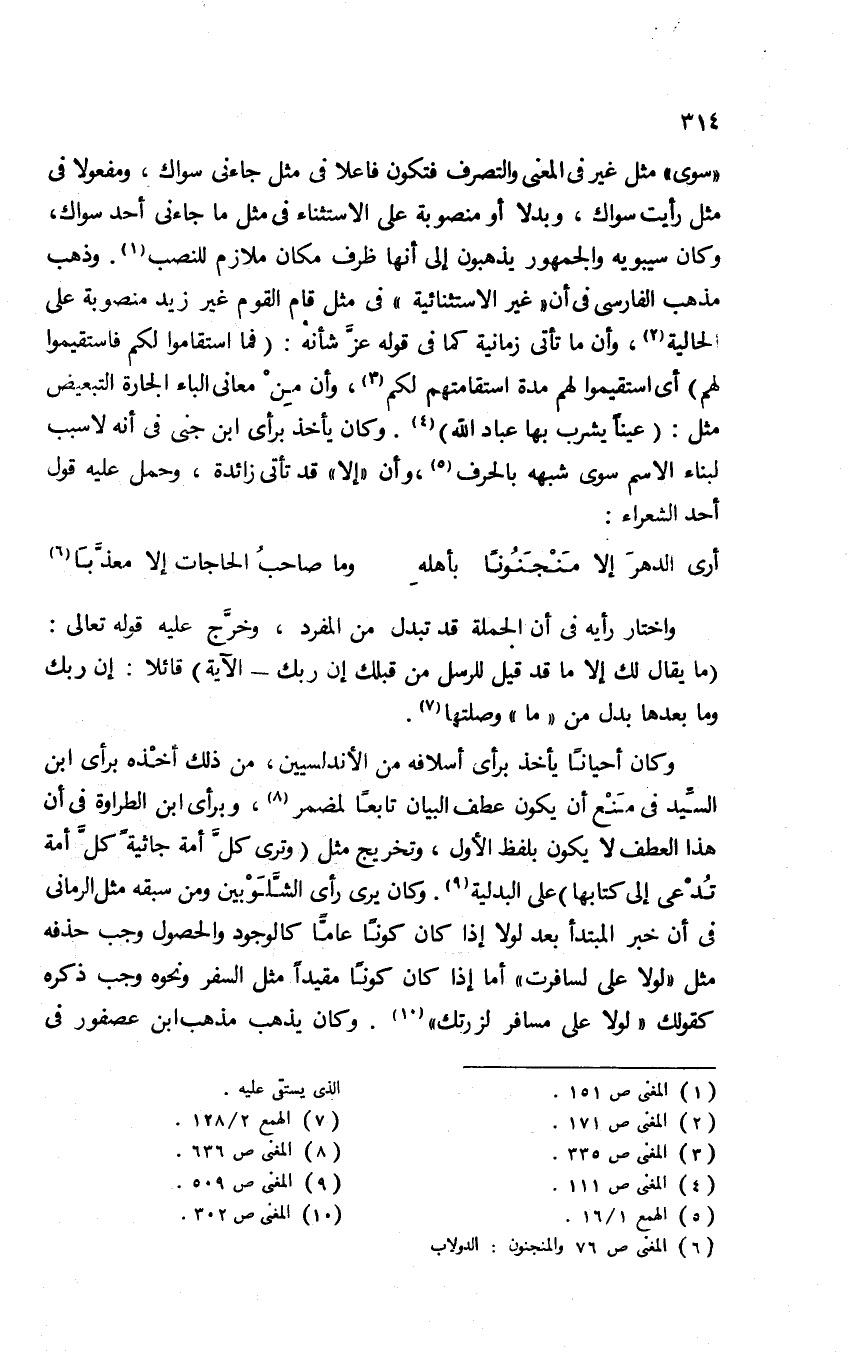 "سوى" مثل غير في المعنى والتصرف فتكون فاعلا في مثل: جاءني سواك، ومفعولا في مثل: رأيت سواك, وبدلا أو منصوبة على الاستثناء في مثل: ما جاءني أحد سواك، وكان سيبويه والجمهور يذهبون إلى أنها ظرف مكان ملازم للنصب1. وذهب مذهب الفارسي في أن "غير الاستثنائية" في مثل: قام القوم غير زيد منصوبة على الحالية2، وأن ما تأتي زمانية كما في قوله عز شأنه: {فَمَا اسْتَقَامُوا لَكُمْ فَاسْتَقِيمُوا لَهُمْ} أي: استقيموا لهم مدة استقامتهم لكم3، وأن من معاني الباء الجارة التبعيض مثل: {عَيْنًا يَشْرَبُ بِهَا عِبَادُ اللَّهِ} 4. وكان يأخذ برأي ابن جني في أنه لا سبب لبناء الاسم سوى شبهه بالحرف5، وأن "إلا" قد تأتي زائدة، وحمل عليه قول أحد الشعراء: