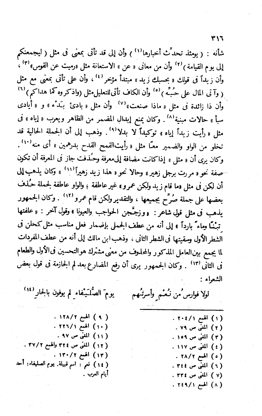 إلى أنه من عطف الجمل بإضمار فعل مناسب مثل: كحلن في الشطر الأول وسقيتها في الشطر الثاني، وذهب ابن مالك إلى أنه من عطف المفردات لما يجمع بين العامل المذكور والمحذوف من معنى مشترك هو التحسين في الأول والطعام في الثاني13. وكان الجمهور يرى أن رفع المضارع بعد لم الجازمة في قول بعض الشعراء: