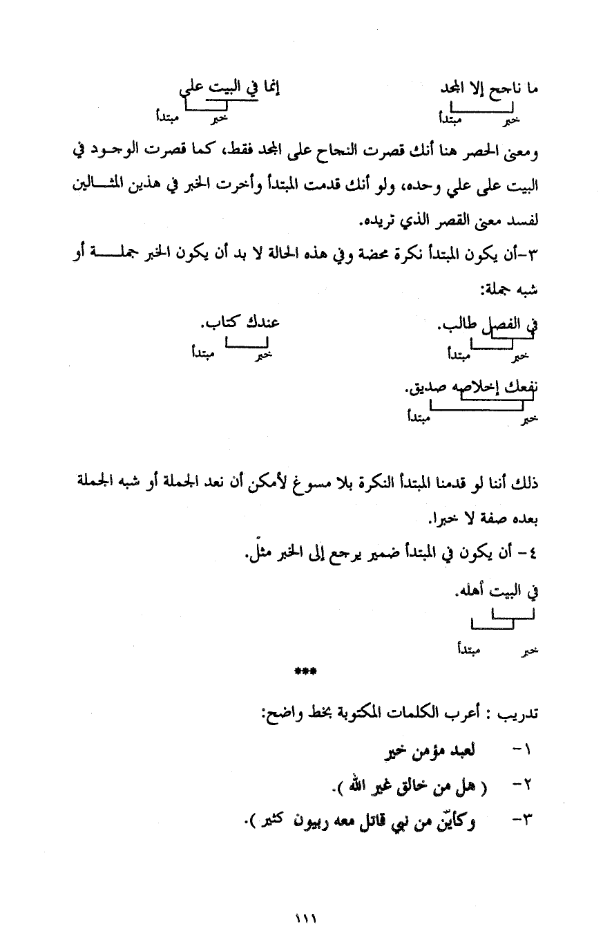 ومعنى الحصر هنا أنك قصرت النجاح على المجد فقط، كما قصرت الوجود في البيت على علي وحده، ولو أنك قدمت المبتدأ وأخرت الخبر في هذين المثالين لفسد معنى القصر الذي تريده.