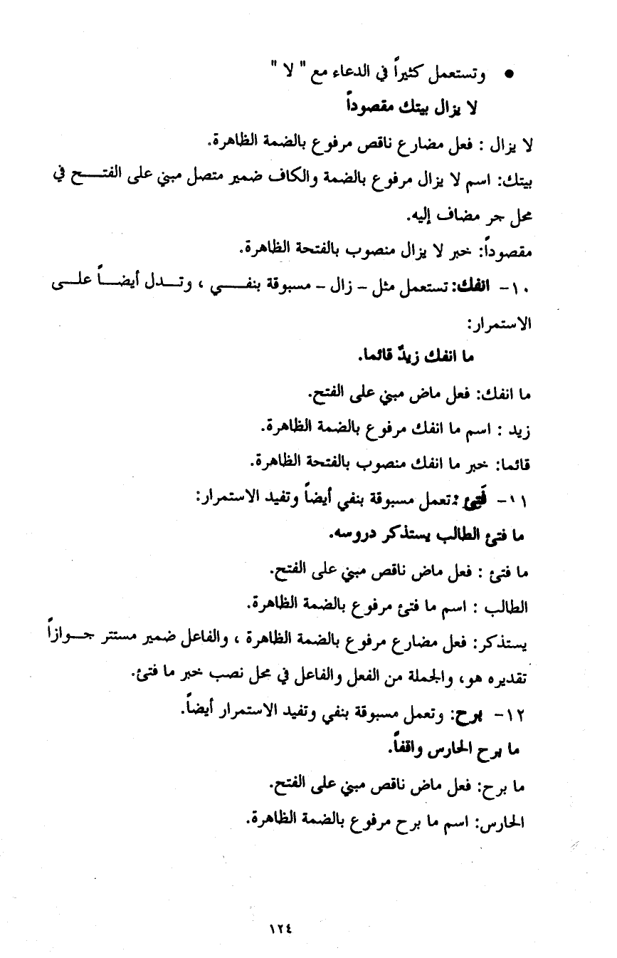 10- انفك: تستعمل مثل زال مسبوقة بنفي، وتدل أيضا على الاستمرار: