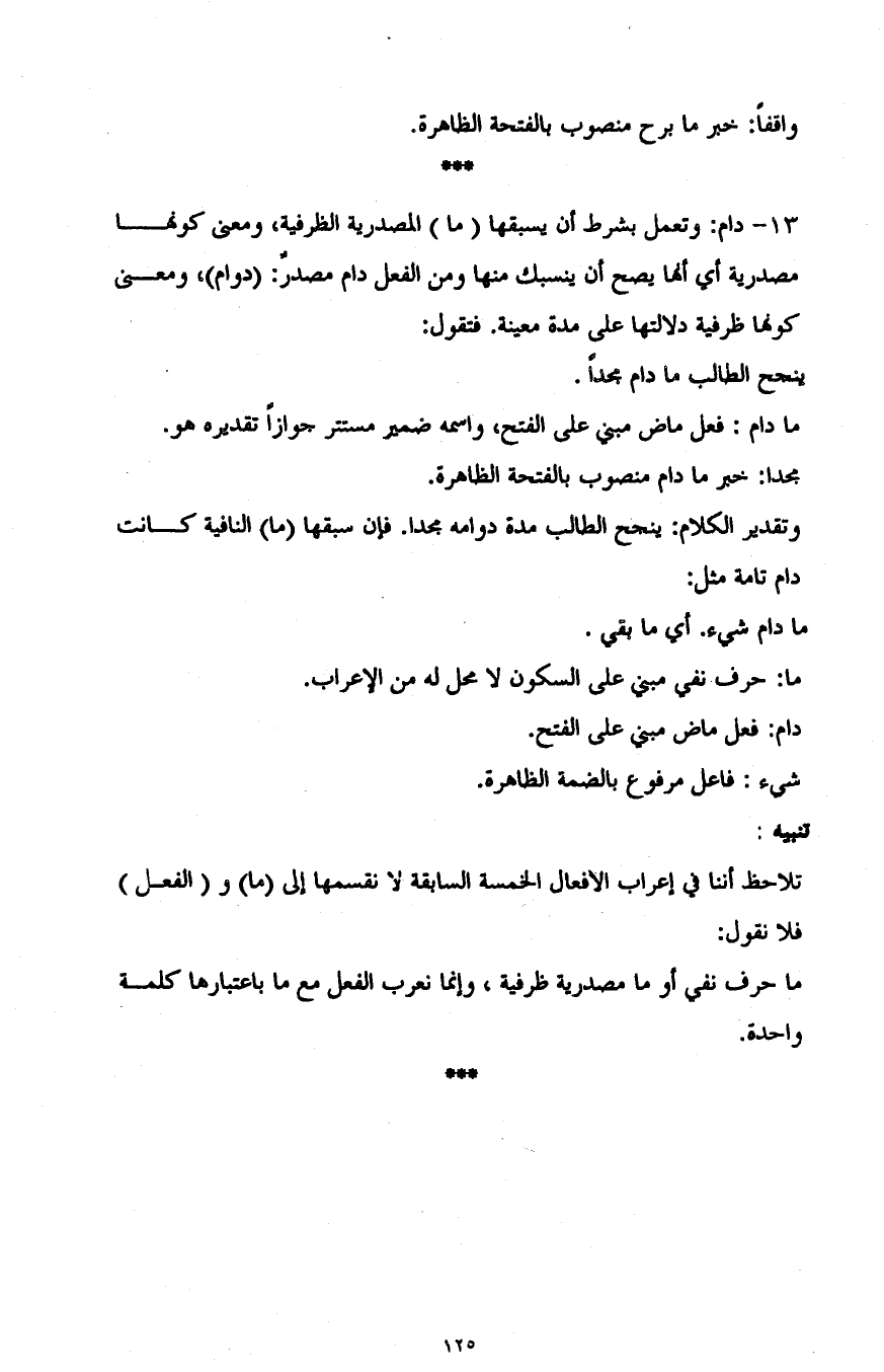 13- دام: وتعمل بشرط أن يسبقها "ما" المصدرية الظرفية، ومعنى كونها مصدرية أي أنها يصح أن ينسبك منها ومن الفعل دام مصدر "دوام"، ومعنى كونها ظرفية دلالتها على مدة معينة، فتقول: