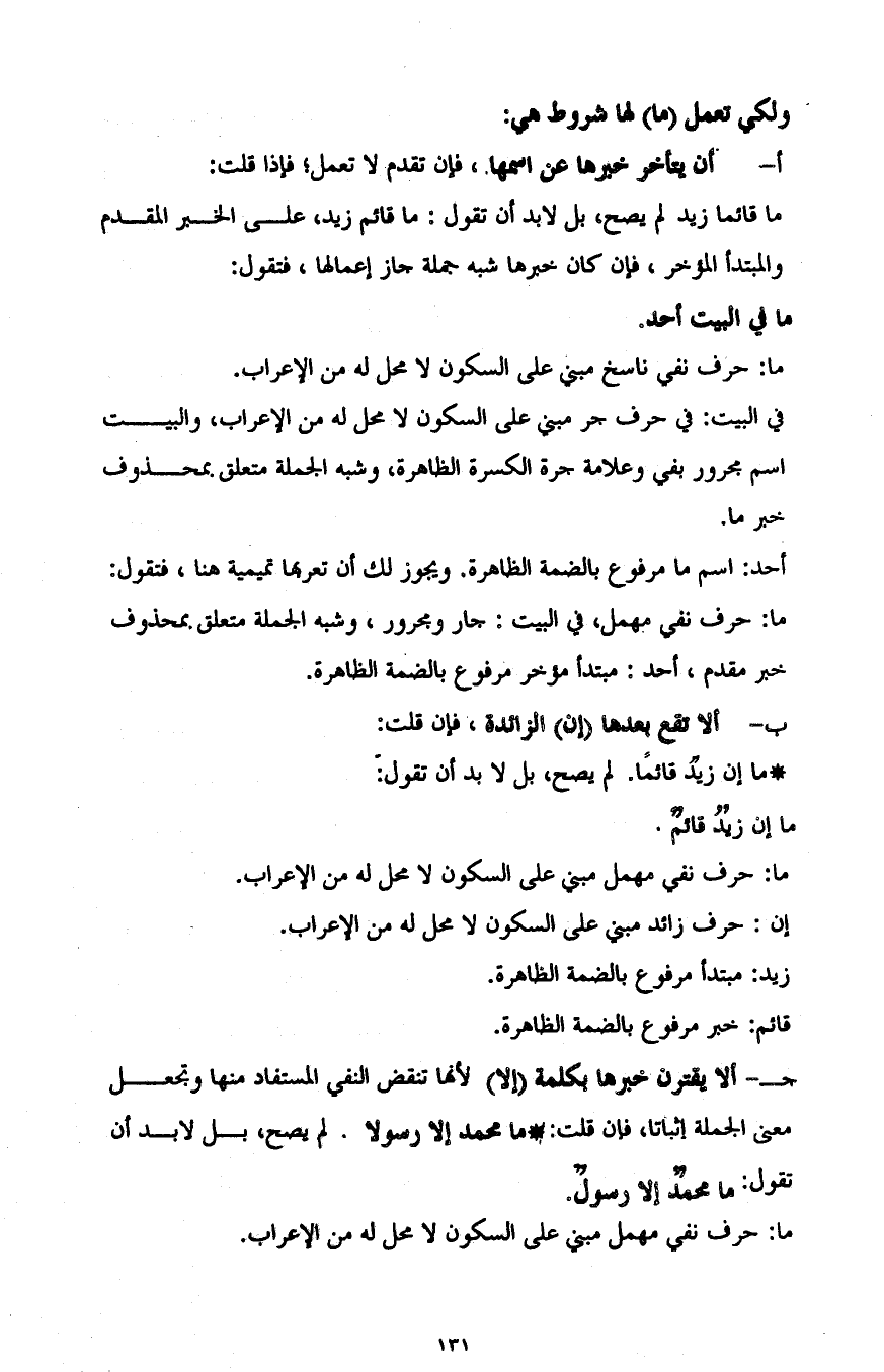جـ- ألا يقترن خبرها بكلمة "إلا" لأنها تنقض النفي المستفاد منها وتجعل معنى الجملة إثباتا، فإن قلت: ما محمد إلا رسولا، لم يصح، بل لا بد أن تقول: