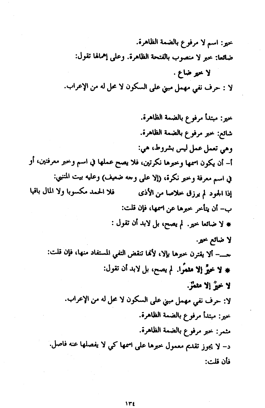 جـ- ألا يقترن خبرها بإلا؛ لأنها تنقض النفي المستفاد منها، فإن قلت: لا خيرٌ إلا مثمرا. لم يصح، بل لا بد أن تقول: