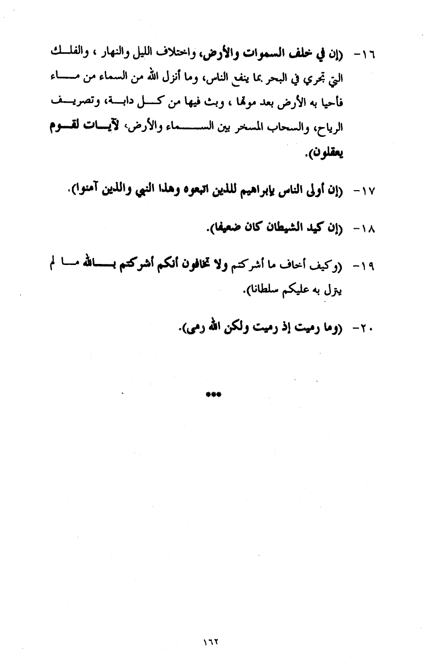 16- {إِنَّ فِي خَلْقِ السَّمَاوَاتِ وَالْأَرْضِ وَاخْتِلَافِ اللَّيْلِ وَالنَّهَارِ وَالْفُلْكِ الَّتِي تَجْرِي فِي الْبَحْرِ بِمَا يَنْفَعُ النَّاسَ وَمَا أَنْزَلَ اللَّهُ مِنَ السَّمَاءِ مِنْ مَاءٍ فَأَحْيَا بِهِ الْأَرْضَ بَعْدَ مَوْتِهَا وَبَثَّ فِيهَا مِنْ كُلِّ دَابَّةٍ وَتَصْرِيفِ الرِّيَاحِ وَالسَّحَابِ الْمُسَخَّرِ بَيْنَ السَّمَاءِ وَالْأَرْضِ لَآيَاتٍ لِقَوْمٍ يَعْقِلُونَ} .