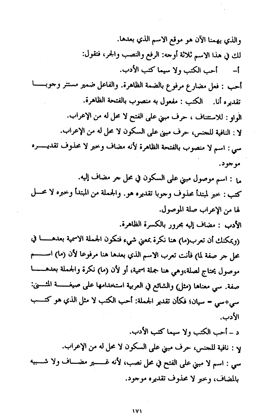 "ويمكنك أن تعرب "ما" هنا نكرة بمعنى شيء، فتكون الجملة الاسمية بعدها في محل جر صفة لما" فأنت تعرب الاسم الذي بعدها هنا مرفوعا؛ لأن "ما" اسم موصول يحتاج لصلة، وهي هنا جملة اسمية، أو لأن "ما" نكرة والجملة بعدها صفة. سي معناها "مثل" والشائع في العربية استخدامها على صيغة المثنى: سي + سي = سيان؛ فكأن تقدير الجملة: أحب الكتب لا مثل الذي هو كتب الأدب.