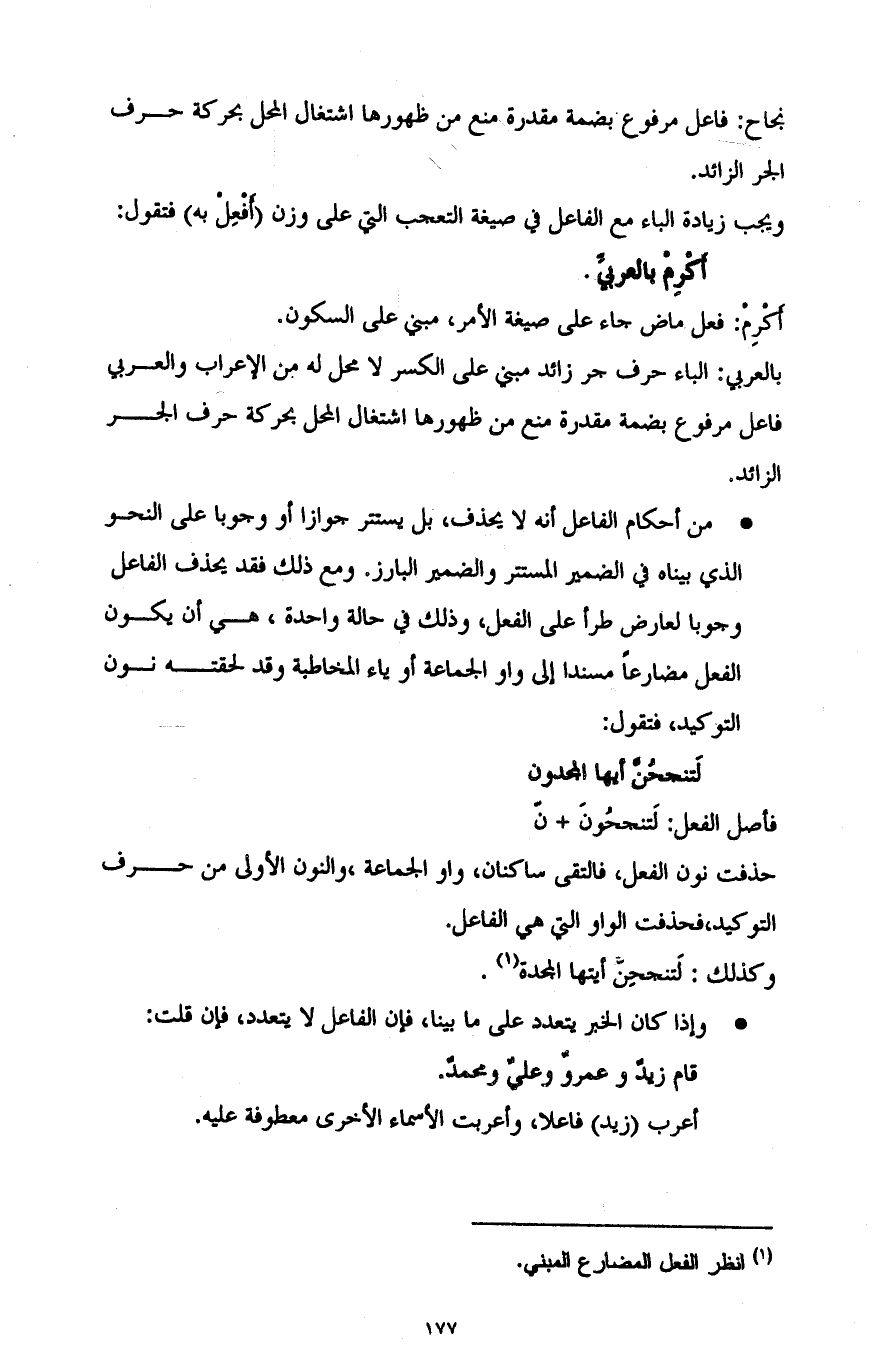 - من أحكام الفاعل أنه لا يحذف، بل يستتر جوازا أو وجوبا على النحو الذي بيناه في الضمير المستتر والضمير البارز. ومع ذلك فقد يحذف الفاعل وجوبا لعارض طرأ على الفعل، وذلك في حالة واحدة، هي أن يكون الفعل مضارعا مسندا إلى واو الجماعة أو ياء المخاطبة وقد لحقته نون التوكيد، فتقول: