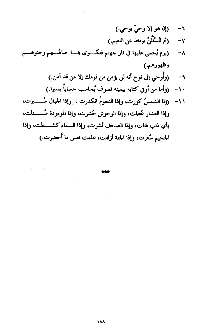 11- {إِذَا الشَّمْسُ كُوِّرَتْ، وَإِذَا النُّجُومُ انْكَدَرَتْ، وَإِذَا الْجِبَالُ سُيِّرَتْ، وَإِذَا الْعِشَارُ عُطِّلَتْ، وَإِذَا الْوُحُوشُ حُشِرَتْ، وَإِذَا الْبِحَارُ سُجِّرَتْ، وَإِذَا النُّفُوسُ زُوِّجَتْ، وَإِذَا الْمَوْءُودَةُ سُئِلَتْ، بِأَيِّ ذَنْبٍ قُتِلَتْ، وَإِذَا الصُّحُفُ نُشِرَتْ، وَإِذَا السَّمَاءُ كُشِطَتْ، وَإِذَا الْجَحِيمُ سُعِّرَتْ، وَإِذَا الْجَنَّةُ أُزْلِفَتْ، عَلِمَتْ نَفْسٌ مَا أَحْضَرَتْ} .