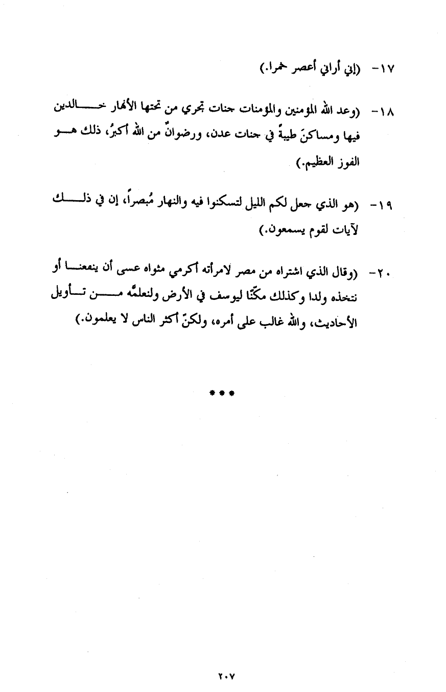 20- {وَقَالَ الَّذِي اشْتَرَاهُ مِنْ مِصْرَ لِامْرَأَتِهِ أَكْرِمِي مَثْوَاهُ عَسَى أَنْ يَنْفَعَنَا أَوْ نَتَّخِذَهُ وَلَدًا وَكَذَلِكَ مَكَّنَّا لِيُوسُفَ فِي الْأَرْضِ وَلِنُعَلِّمَهُ مِنْ تَأْوِيلِ الْأَحَادِيثِ وَاللَّهُ غَالِبٌ عَلَى أَمْرِهِ وَلَكِنَّ أَكْثَرَ النَّاسِ لَا يَعْلَمُونَ} .