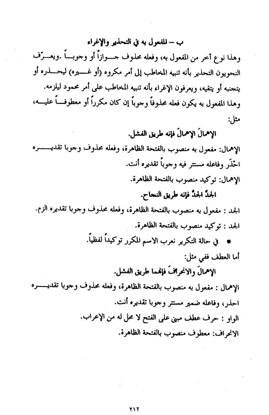 وهذا نوع آخر من المفعول به، وفعله محذوف جوازا أو وجوبا، ويعرف النحويون التحذير بأنه تنبيه المخاطب إلى أمر مكروه "أو غيره" ليحذره أو يتجنبه أو يتقيه، ويعرفون الإغراء بأنه تنبيه المخاطب على أمر محمود ليلزمه.