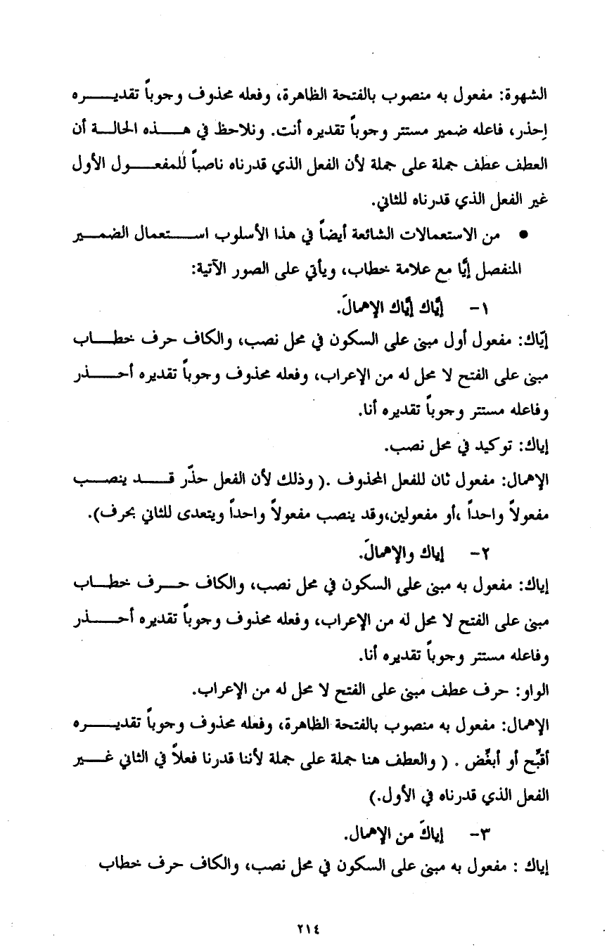 إياك: مفعول أول مبني على السكون في محل نصب، والكاف حرف خطاب مبني على الفتح لا محل له من الإعراب، وفعله محذوف وجوبا تقديره أُحذِّر، وفاعله مستتر وجوبا تقديره أنا.