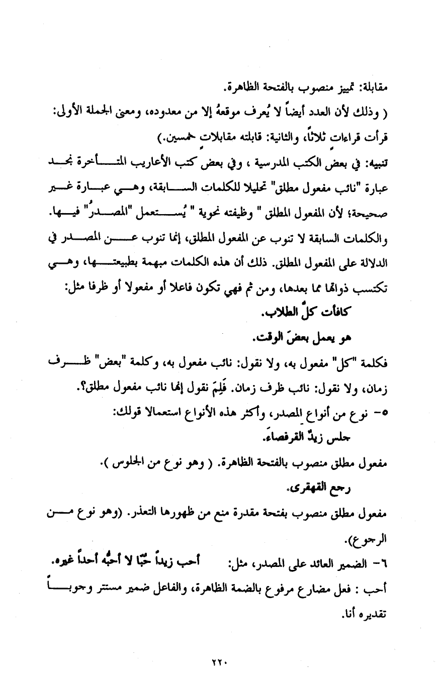 تنبيه: في بعض الكتب المدرسية، وفي بعض كتب الأعاريب المتأخرة نجد عبارة "نائب مفعول مطلق" تحليلا للكلمات السابقة، وهي عبارة غير صحيحة؛ لأن المفعول المطلق "وظيفته نحوية" يستعمل "المصدر" فيها. والكلمات السابقة لا تنوب عن المفعول المطلق، إنما تنوب عن المصدر في الدلالة على المفعول المطلق؛ ذلك أن هذه الكلمات مبهمة بطبيعتها، وهي تكتسب ذواتها مما بعدها، ومن ثَمَّ فهي تكون فاعلا أو مفعولا أو ظرفا مثل: