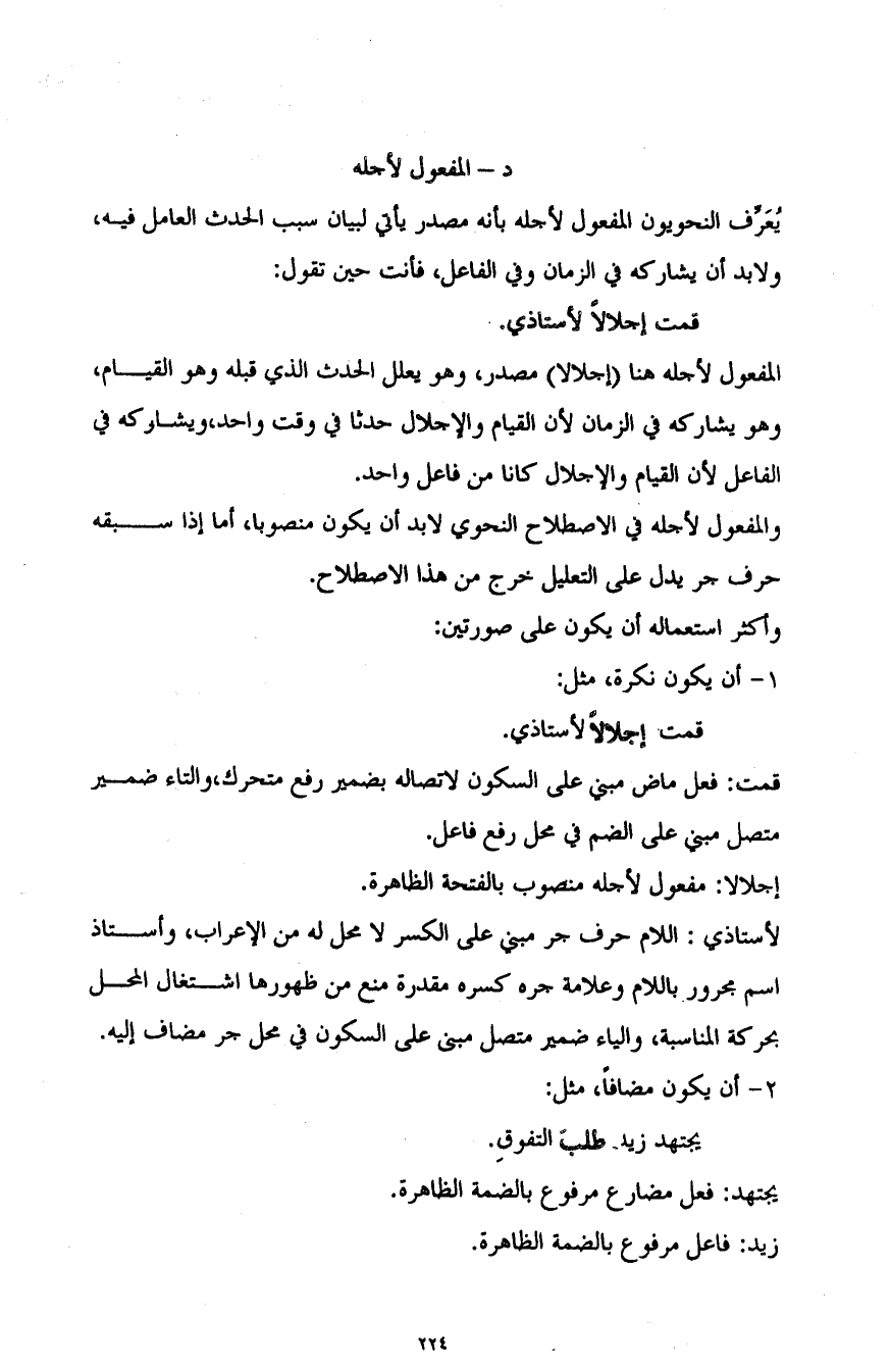 يُعَرِّف النحويون المفعول لأجله بأنه مصدر يأتي لبيان سبب الحدث العامل فيه، ولا بد أن يشاركه في الزمان وفي الفاعل، فأنت حين تقول: