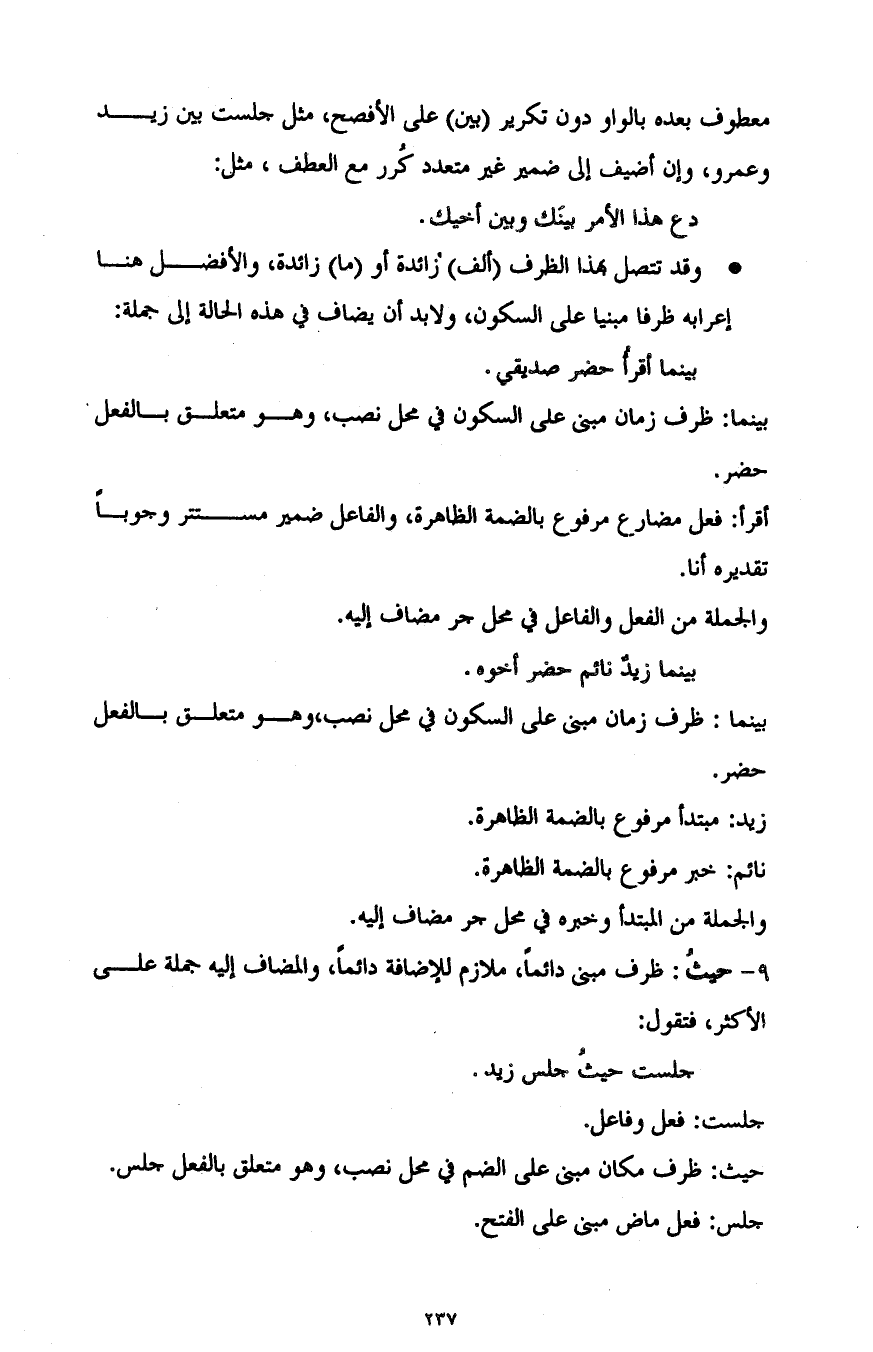 معطوف بعده بالواو دون تكرير "بين" على الأفصح، مثل: جلست بين زيد وعمرو، وإن أضيف إلى ضمير غير متعدد كُرر مع العطف، مثل: