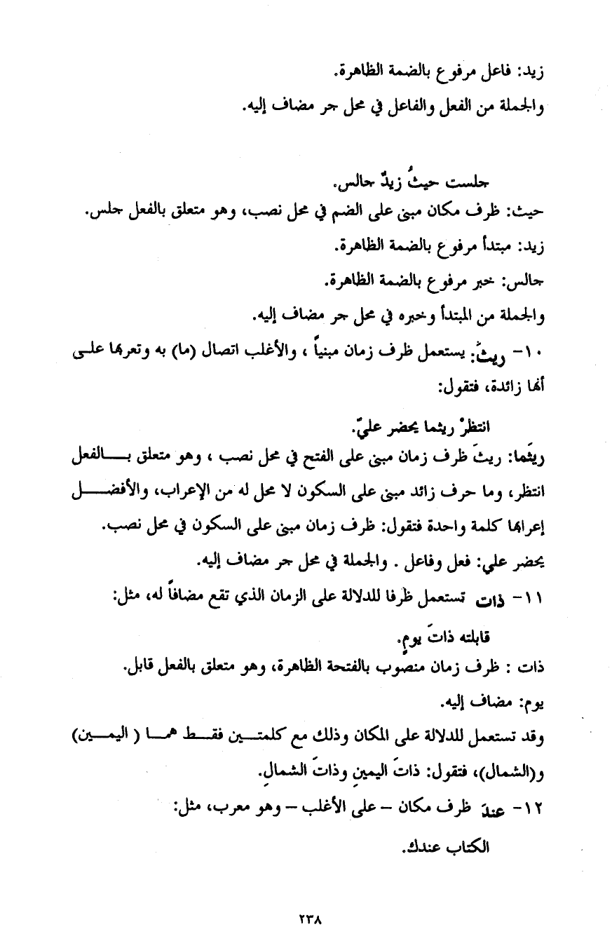 10- ريثَ: يستعمل ظرف زمان مبنيا، والأغلب اتصال "ما" به وتعربها على أنها زائدة، فتقول:
