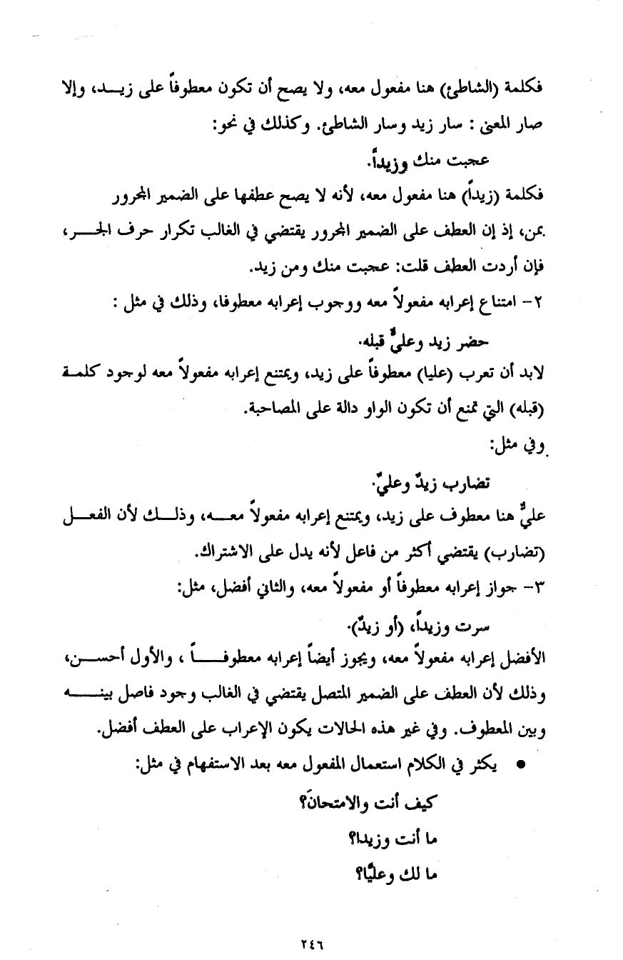 2- امتناع إعرابه مفعولا معه ووجوب إعرابه معطوفا، وذلك في مثل: