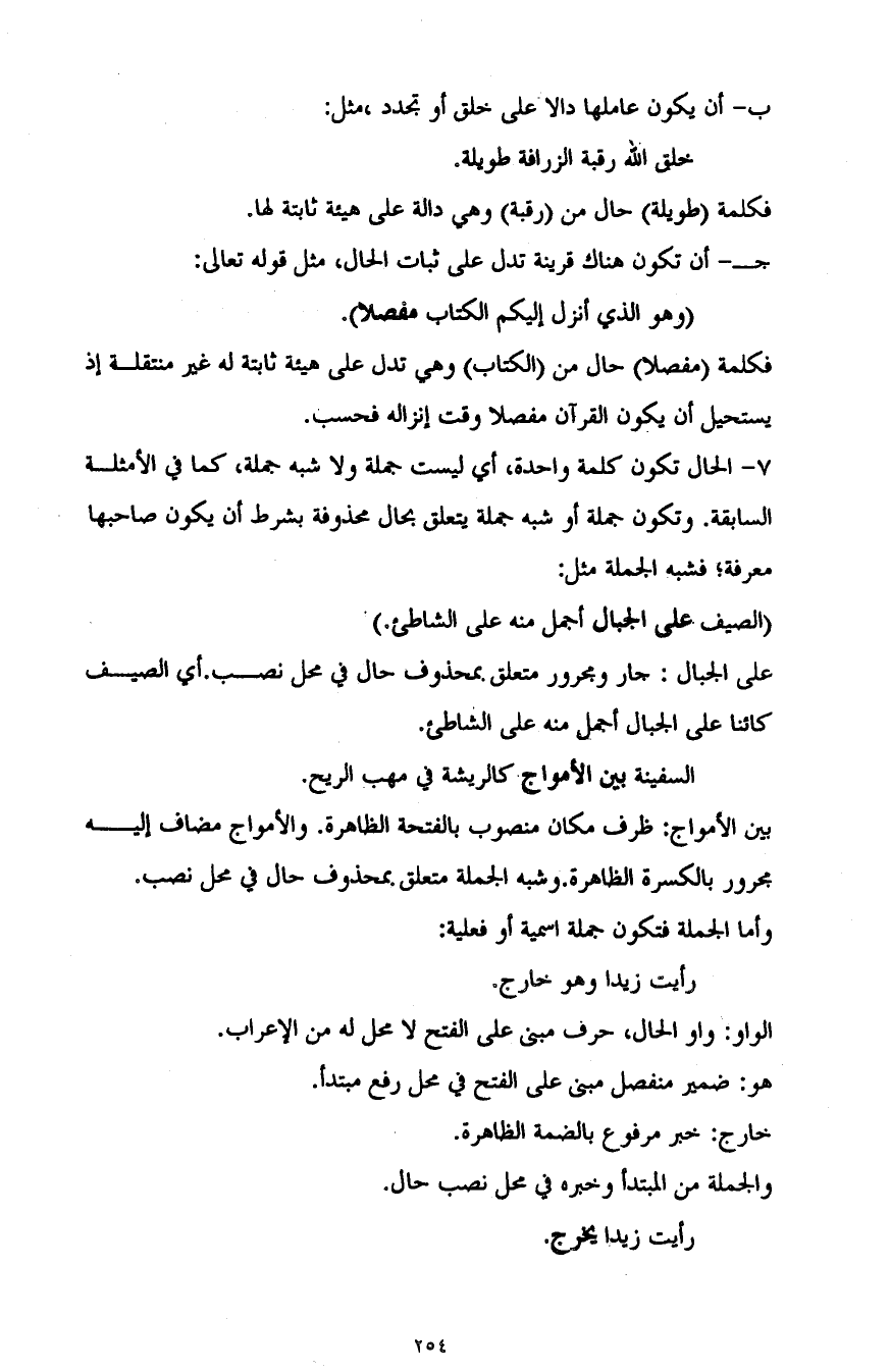 7- الحال تكون كلمة واحدة، أي ليست جملة ولا شبه جملة، كما في الأمثلة السابقة. وتكون جملة أو شبه جملة يتعلق بحال محذوفة بشرط أن يكون صاحبها معرفة؛ فشبه الجملة مثل: