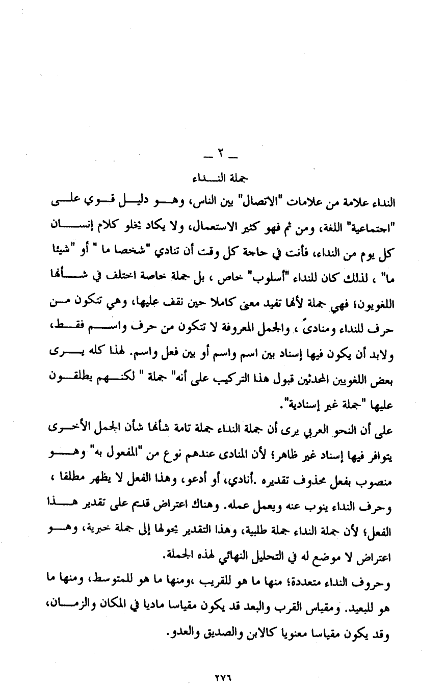 النداء علامة من علامات "الاتصال" بين الناس، وهو دليل قوي على "اجتماعية" اللغة، ومن ثم فهو كثير الاستعمال، ولا يكاد يخلو كلام إنسان كل يوم من النداء، فأنت في حاجة كل وقت أن تنادي "شخصا ما" أو "شيئا ما"؛ لذلك كان للنداء "أسلوب" خاص، بل جملة خاصة اختلف في شأنها اللغويون؛ فهي جملة لأنها تفيد معنى كاملا حين نقف عليها، وهي تتكون من حرف للنداء ومنادى، والجملة المعروفة لا تتكون من حرف واسم فقط، ولا بد أن يكون فيها إسناد بين اسم واسم أو بين فعل واسم؛ لهذا كله يرى بعض اللغويين المحدثين قبول هذا التركيب على أنه "جملة" لكنهم يطلقون عليها "جملة غير إسنادية".
