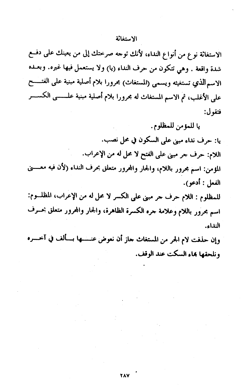 الاستغاثة نوع من أنواع النداء؛ لأنك توجه صرختك إلى من يعينك على دفع شدة واقعة. وهي تتكون من حرف النداء "يا" ولا يستعمل فيها غيره، وبعده الاسم الذي تستغيثه ويسمى "المستغاث" مجرورا بلام أصلية مبنية على الفتح على الأغلب، ثم الاسم المستغاث له مجرورا بلام أصلية مبنية على الكسر فتقول: