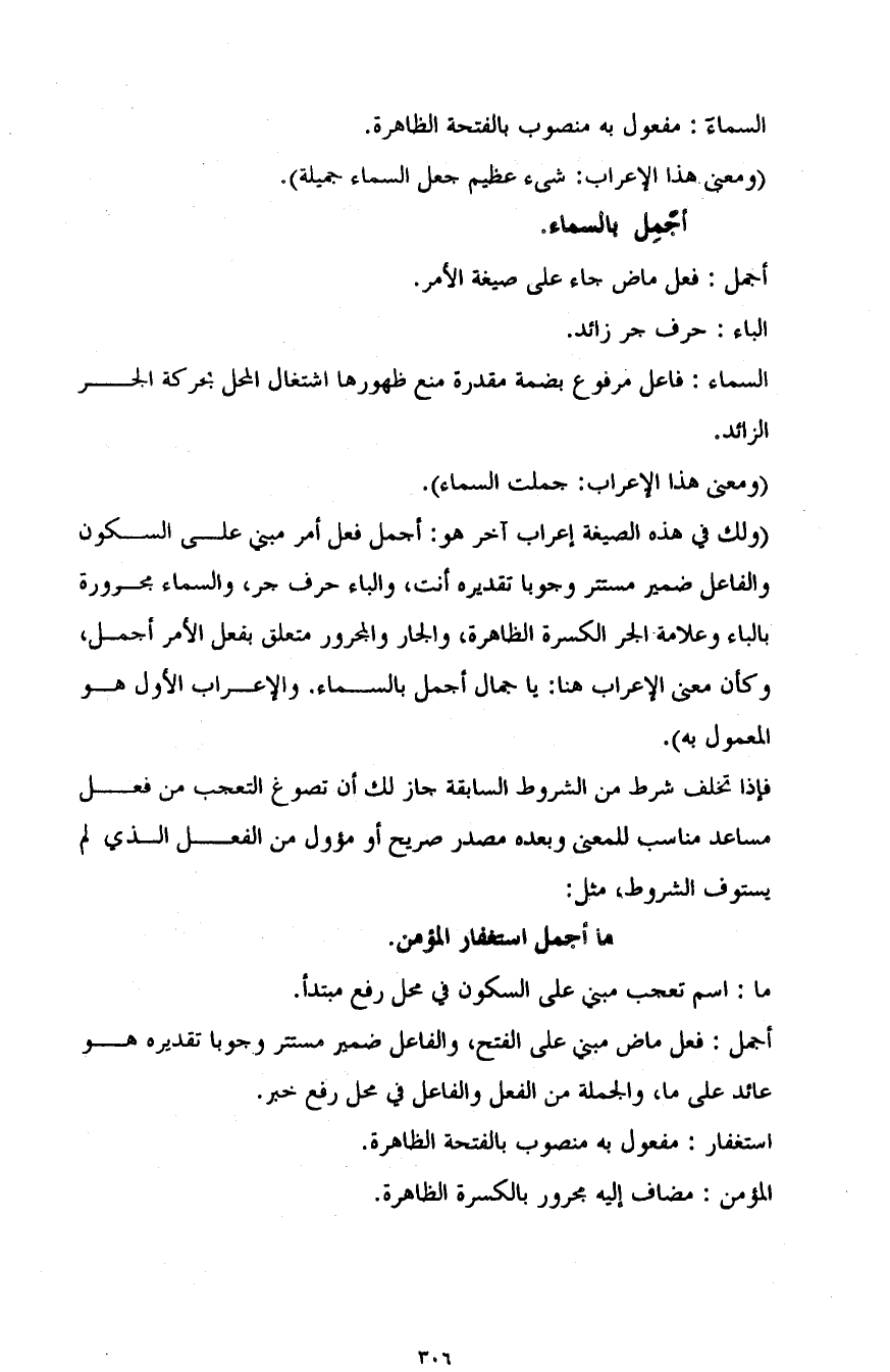 "ولك في هذه الصيغة إعراب آخر هو: أجمل فعل أمر مبني على السكون والفاعل ضمير مستتر وجوبا تقديره أنت، والباء حرف جر، والسماء مجرورة بالباء وعلامة الجر الكسرة الظاهرة، والجار والمجرور متعلق بفعل الأمر أجمل، وكأن معنى الإعراب هنا: يا جمال أجمل بالسماء. والإعراب الأول هو المعمول به".