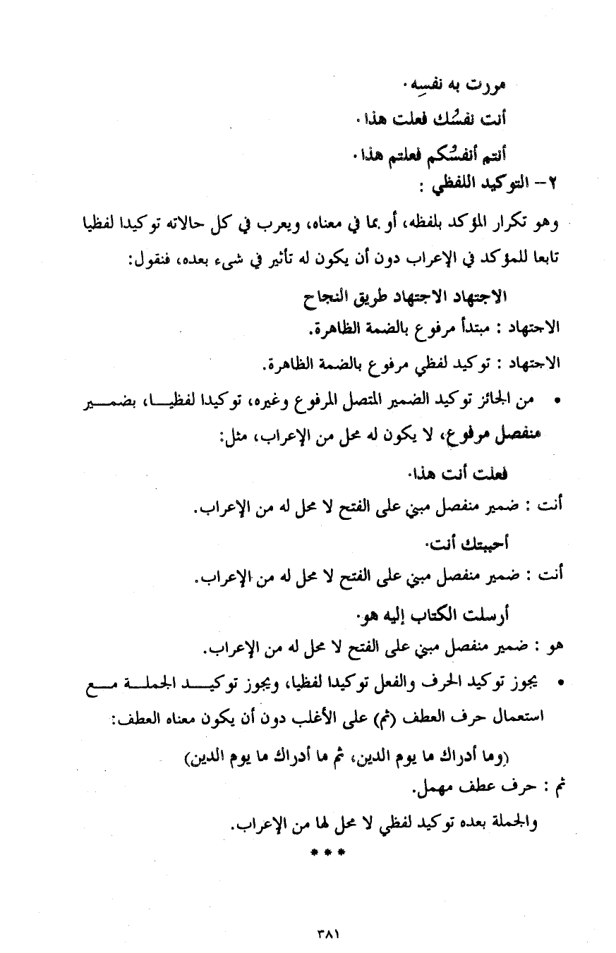 - يجوز توكيد الحرف والفعل توكيدا لفظيا، ويجوز توكيد الجملة مع استعمال حرف العطف "ثم" على الأغلب دون أن يكون معناه العطف: