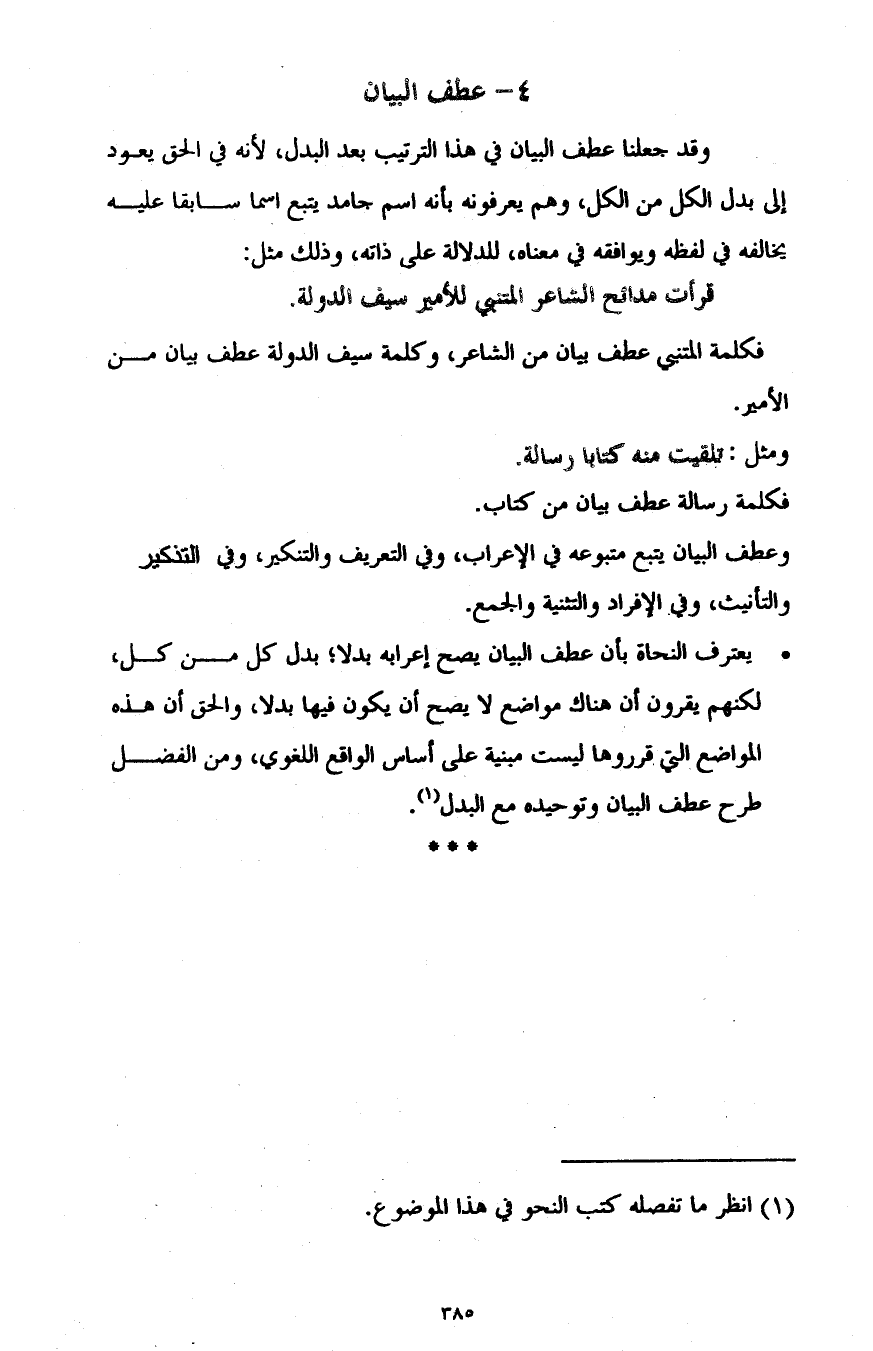 وقد جعلنا عطف البيان في هذا الترتيب بعد البدل؛ لأنه في الحق يعود إلى بدل الكل من الكل، وهم يعرفونه بأنه اسم جامد يتبع اسما سابقا عليه يخالفه في لفظه ويوافقه في معناه، للدلالة على ذاته، وذلك مثل: