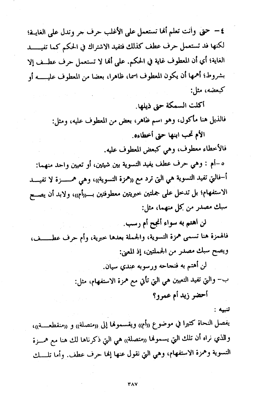 يفصل النحاة كثيرا في موضوع "أم" ويقسمونها إلى "متصلة" و"منقطعة"، والذي نراه أن تلك التي يسمونها "متصلة" هي التي ذكرناها لك هنا مع همزة التسوية وهمزة الاستفهام، وهي التي نقول عنها: إنها حرف عطف، وأما تلك