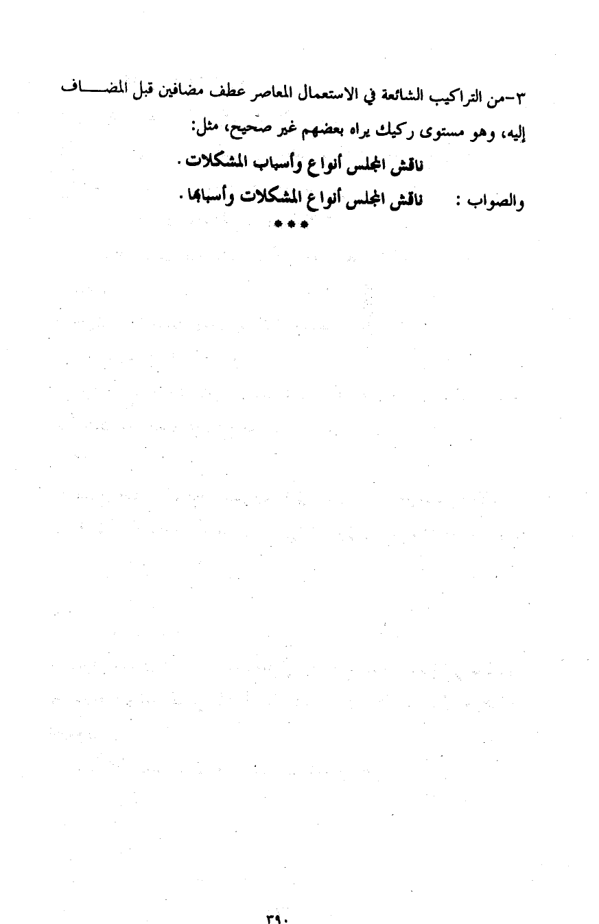 3- من التراكيب الشائعة في الاستعمال المعاصر عطف مضافين قبل المضاف إليه، وهو مستوى ركيك يراه بعضهم غير صحيح، مثل: