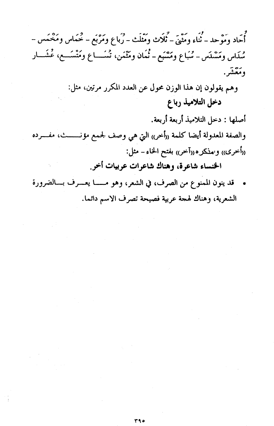 أُحَاد ومَوْحَد - ثناء ومثنى - ثلاث ومثلث - رباع ومربع - خماس ومخمس - سداس ومسدس- سباع ومسبع - ثمان ومثمن - تساع ومتسع - عشار ومعشر.