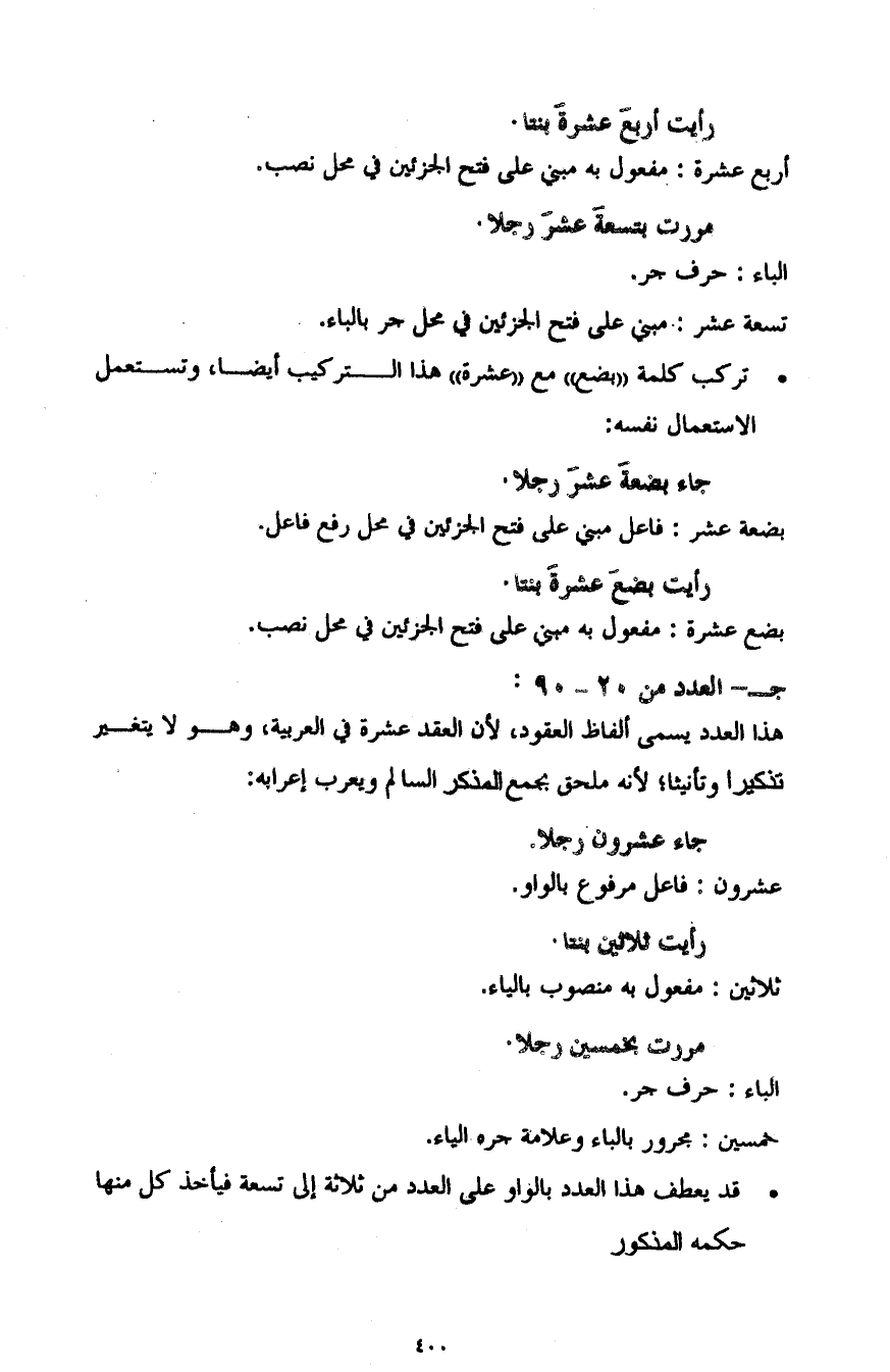 هذا العدد يسمى ألفاظ العقود؛ لأن العقد عشرة في العربية، وهو لا يتغير تذكيرا وتأنيثا؛ لأنه ملحق بجمع المذكر السالم ويعرب إعرابه: