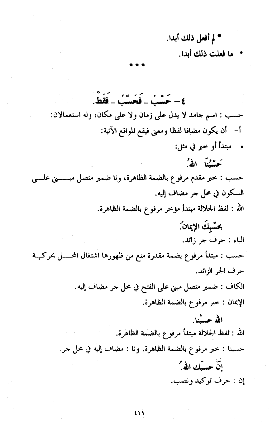 حسب: اسم جامد لا يدل على زمان ولا على مكان، وله استعمالان: