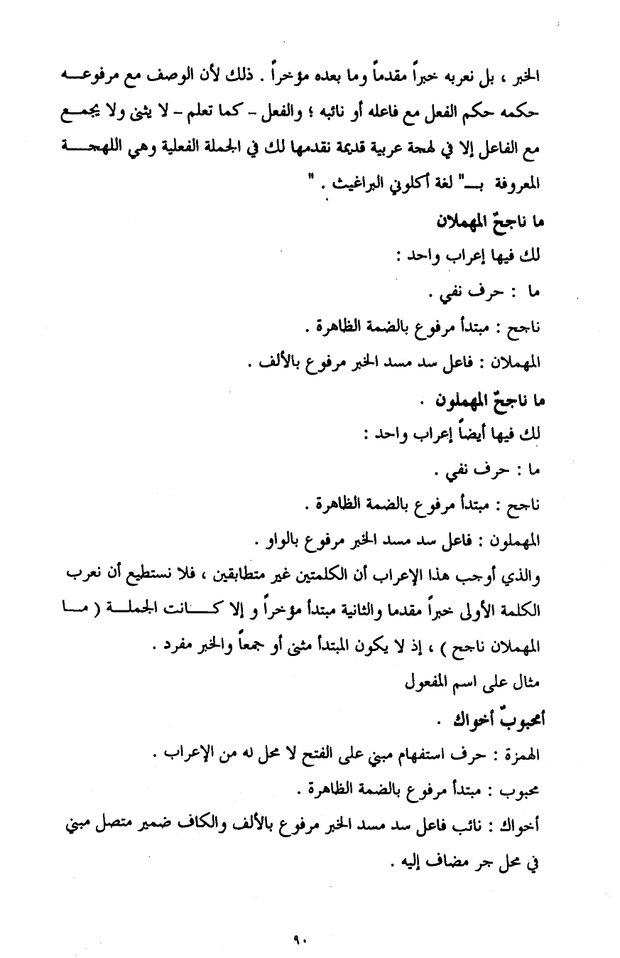 الخبر، بل نعربه خبرًا مقدمًا وما بعده مؤخرًا؛ ذلك لأن الوصف مع مرفوعه حكمه حكم الفعل مع فاعله أو نائبه؛ والفعل -كما تعلم- لا يثنى ولا يجمع مع الفاعل إلا في لهجة عربية قديمة نقدمها لك في الجملة الفعلية وهي اللهجة المعروفة بـ"لغة أكلوني البراغيث".
