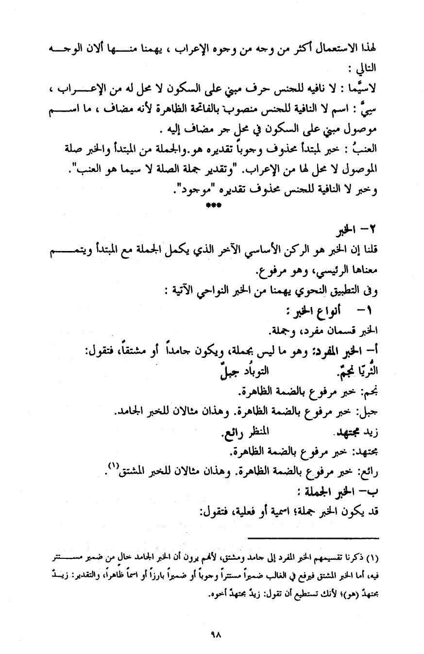 1 ذكرنا تقسيمهم الخبر المفرد إلى جامد ومشتق؛ لأنهم يرون أن الخبر الجامد خالٍ من ضمير مستتر فيه، أما الخبر المشتق فيرفع في الغالب ضميرا مستترا وجوبا أو ضميرا بارزا أو اسما ظاهرا، والتقدير: زيد مجتهد "هو"؛ لأنك تستطيع أن تقول: زيد مجتهد أخوه.