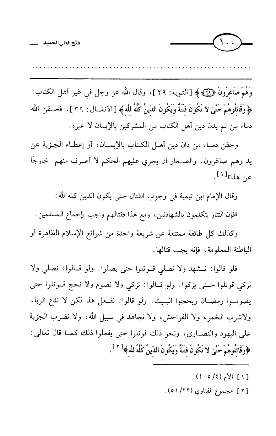 فلو قالوا: نشهد ولا نصلي قوتلوا حتى يصلوا. ولو قالوا: نصلي ولا نزكي قوتلوا حتى يزكوا. ولو قالوا: نزكي ولا نصوم ولا نحج قوتلوا حتى يصوموا رمضان ويحجوا البيت. ولو قالوا: نفعل هذا لكن لا ندع الربا، ولا شرب الخمر، ولا الفواحش، ولا نجاهد في سبيل الله، ولا نضرب الجزية على اليهود والنصارى، ونحو ذلك قوتلوا حتى يفعلوا ذلك كما قال تعالى: {وَقَاتِلُوهُمْ حَتَّى لاَ تَكُونَ فِتْنَةٌ وَيَكُونَ الدِّينُ كُلُّه لِلَّهِ} (¬2)».