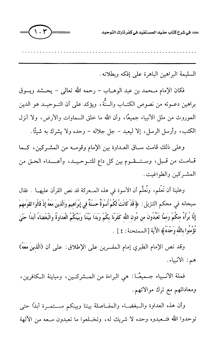 وعلى ذلك قامت ساق العداوة بين الإمام وقومه من المشركين، كما قامت من قبل، وستقوم بين كل داع للتوحيد، وأعداء الحق من المشركين والطواغيت.