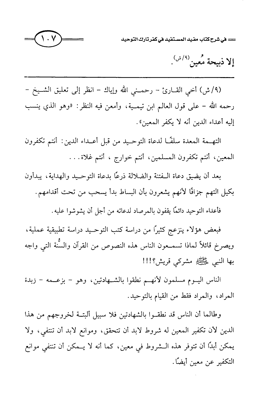 (9/ش) أخي القارئ -رحمني الله وإياك - انظر إلى تعليق الشيخ - رحمه الله - على قول العالم ابن تيمية، وأمعن فيه النظر. «وهو الذي ينسب إليه أعداء الدين أنه لا يكفر المعين».
