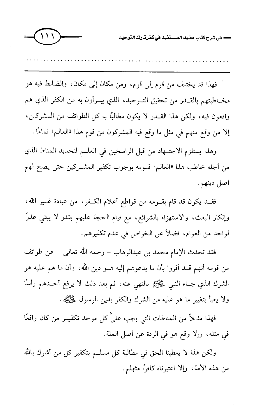 فهذا قد يختلف من قوم إلى قوم، ومن مكان إلى مكان، والضابط فيه هو مخاطبتهم بالقدر من تحقيق التوحيد، الذي يبرأون به من الكفر الذي هم واقعون فيه، ولكن هذا القدر لا يكون مطالبًا به كل الطوائف من المشركين إلاَّ من وقع منهم في مثل ما وقع فيه المشركون من قوم هذا «العالم» تمامًا.