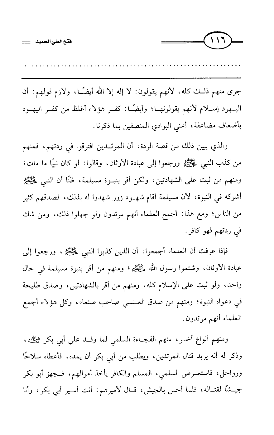 فإذا عرفت أن العلماء أجمعوا أن الذين كذبوا النبي - صلى الله عليه وسلم -، ورجعوا إلى عبادة الأوثان، وشتموا رسول الله - صلى الله عليه وسلم -، ومنهم من أقر بنبوة مسيلمة في حال واحد، ولو ثبت على الإسلام كله، ومنهم من أقر بالشهادتين، وصدَّق طليحة في دعواه النبوة؛ ومنهم من صدَّق العنسي صاحب صنعاء، وكل هؤلاء أجمع العلماء أنهم مرتدين.