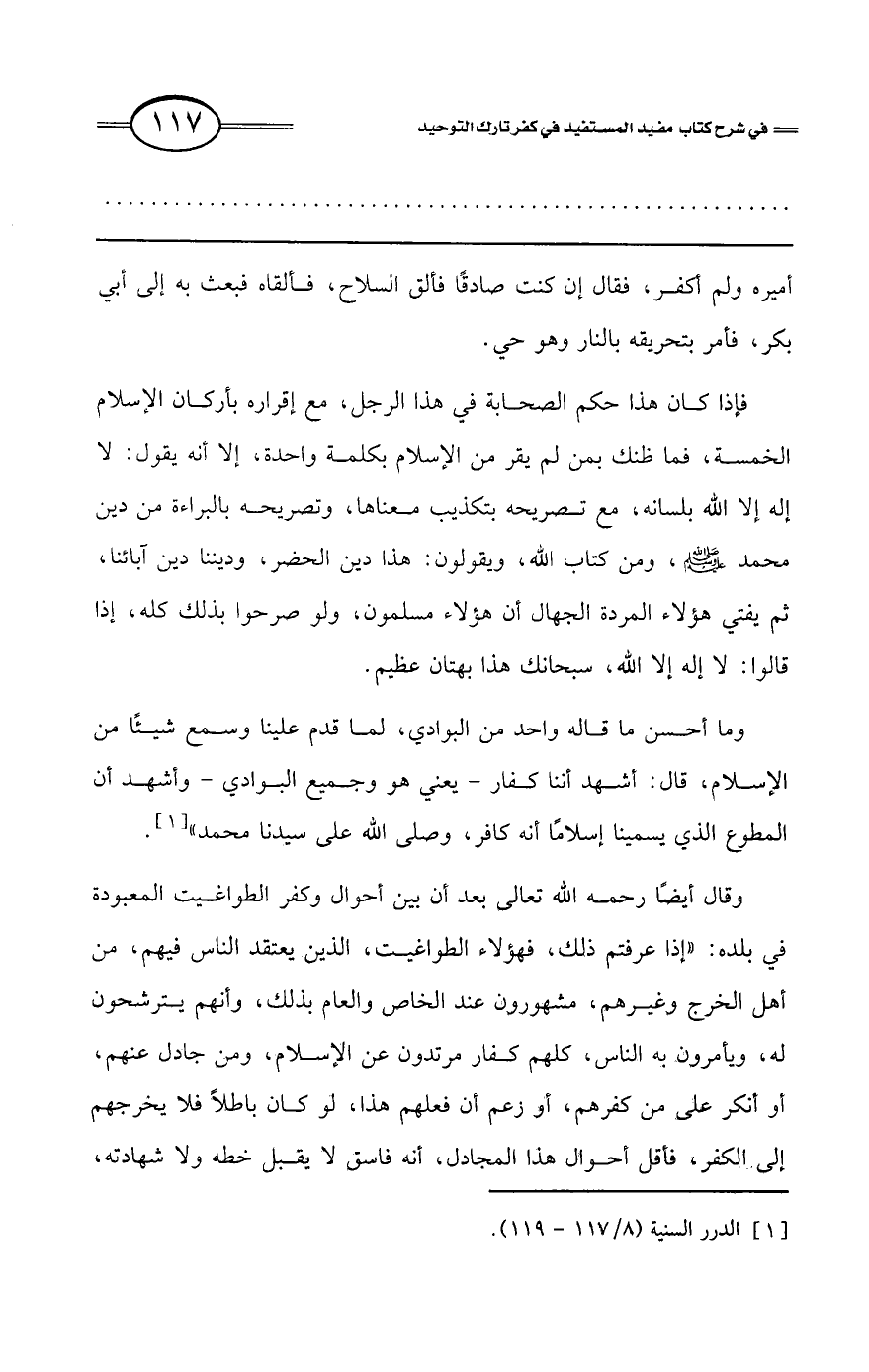 وما أحسن ما قاله واحد من البوادي، لما قدم علينا وسمع شيئًا من الإسلام، قال: أشهد أننا كفار – يعني هو وجميع البوادي – وأشهد أن المطوع الذي يسمينا إسلامًا أنه كافر، وصلى الله على سيدنا محمد» (¬1).