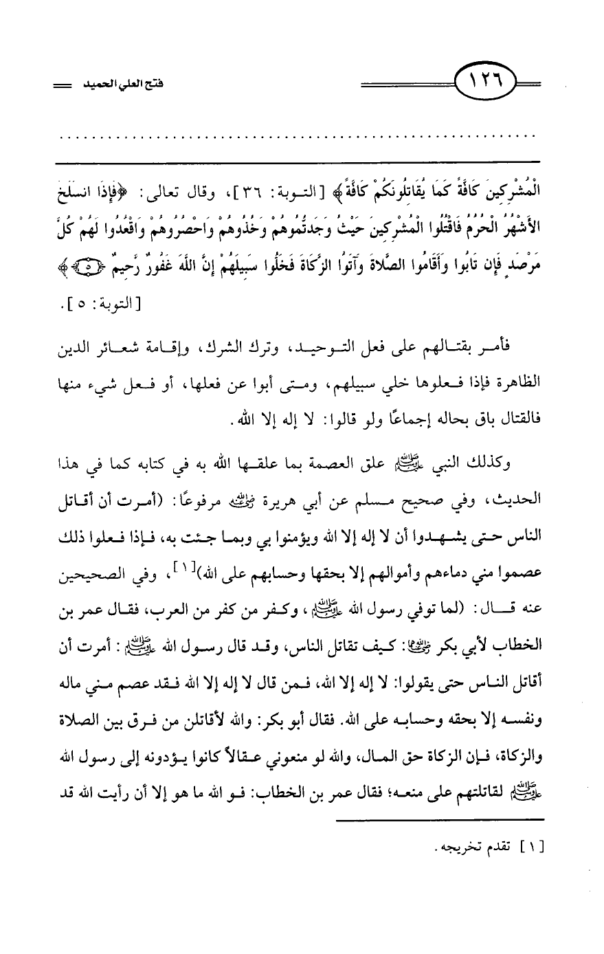 وفي الصحيحين عنه قال: (لما توفي رسول الله - صلى الله عليه وسلم -، وكفر من كفر من العرب، فقال عمر بن الخطاب لأبي بكر رضي الله عنهما: كيف تقاتل الناس، وقد قال رسول الله - صلى الله عليه وسلم -: أمرت أن أقاتل الناس حتى يقولوا: لا إله إلا الله، فمن قال لا إله إلا الله فقد عصم مني ماله ونفسه إلا بحقه وحسابه على الله. فقال أبو بكر: والله لأقاتلن من فرق بين الصلاة والزكاة، فإن الزكاة حق المال،