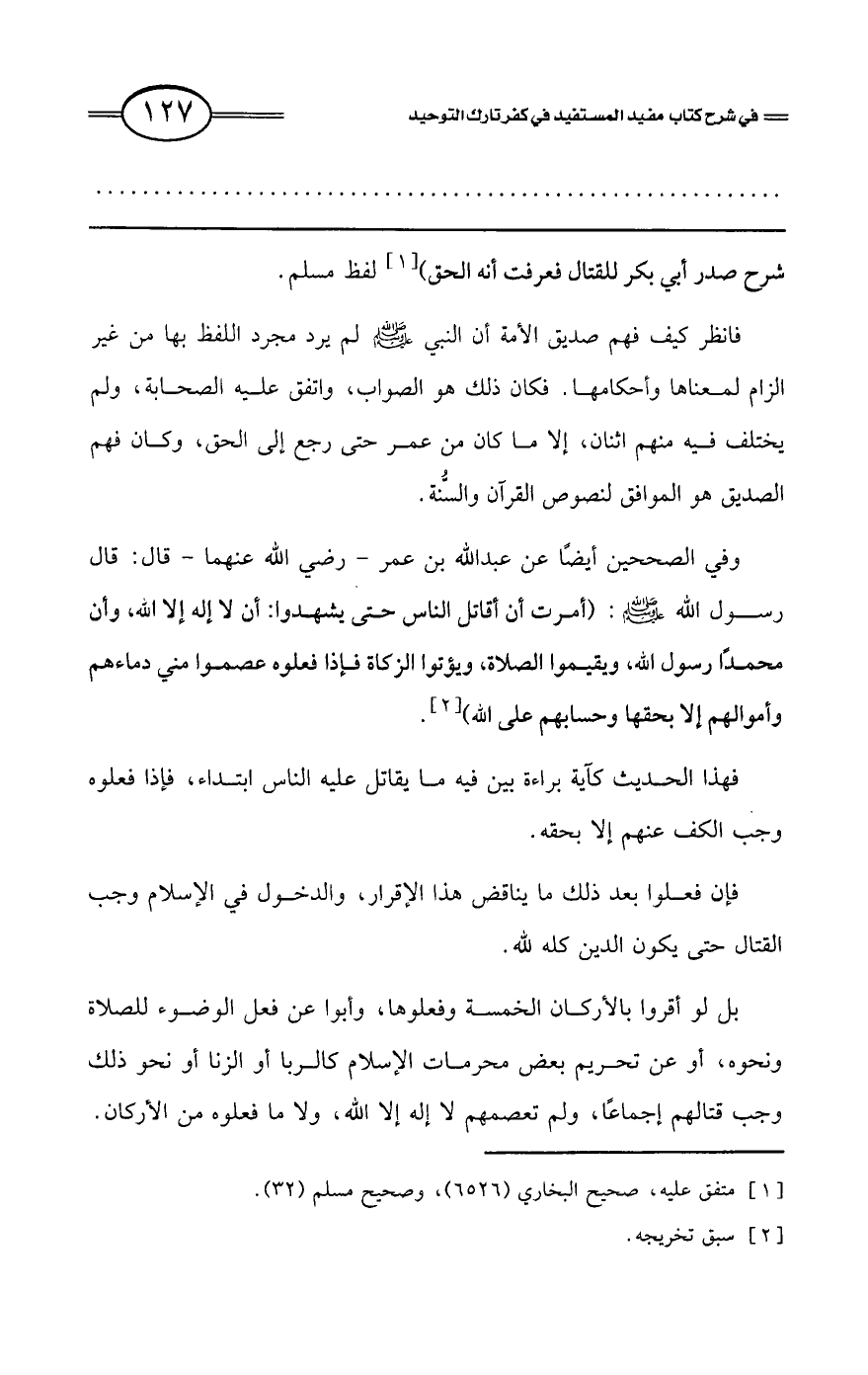 فانظر كيف فهم صديق الأمة أن النبي - صلى الله عليه وسلم - لم يرد مجرد اللفظ بها من غير إلزام لمعناها وأحكامها. فكان ذلك هو الصواب، واتفق عليه الصحابة، ولم يختلف فيه منهم اثنان، إلا ما كان من عمر حتى رجع إلى الحق، وكان فهم الصديق هو الموافق لنصوص القرآن والسنة.